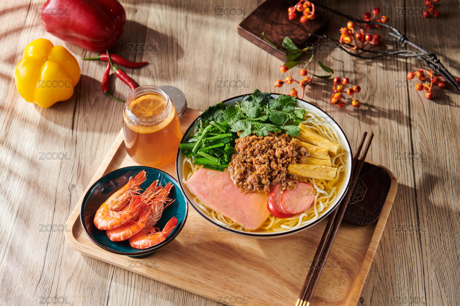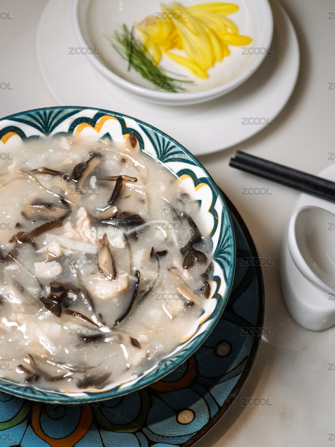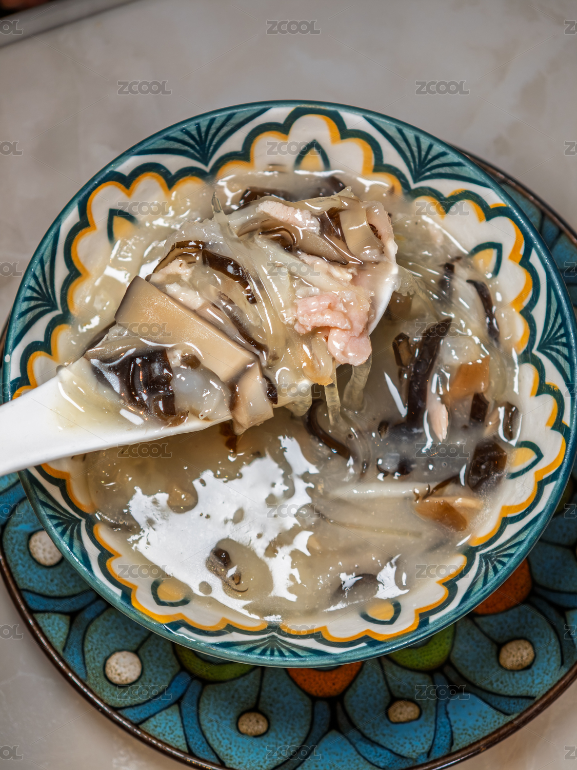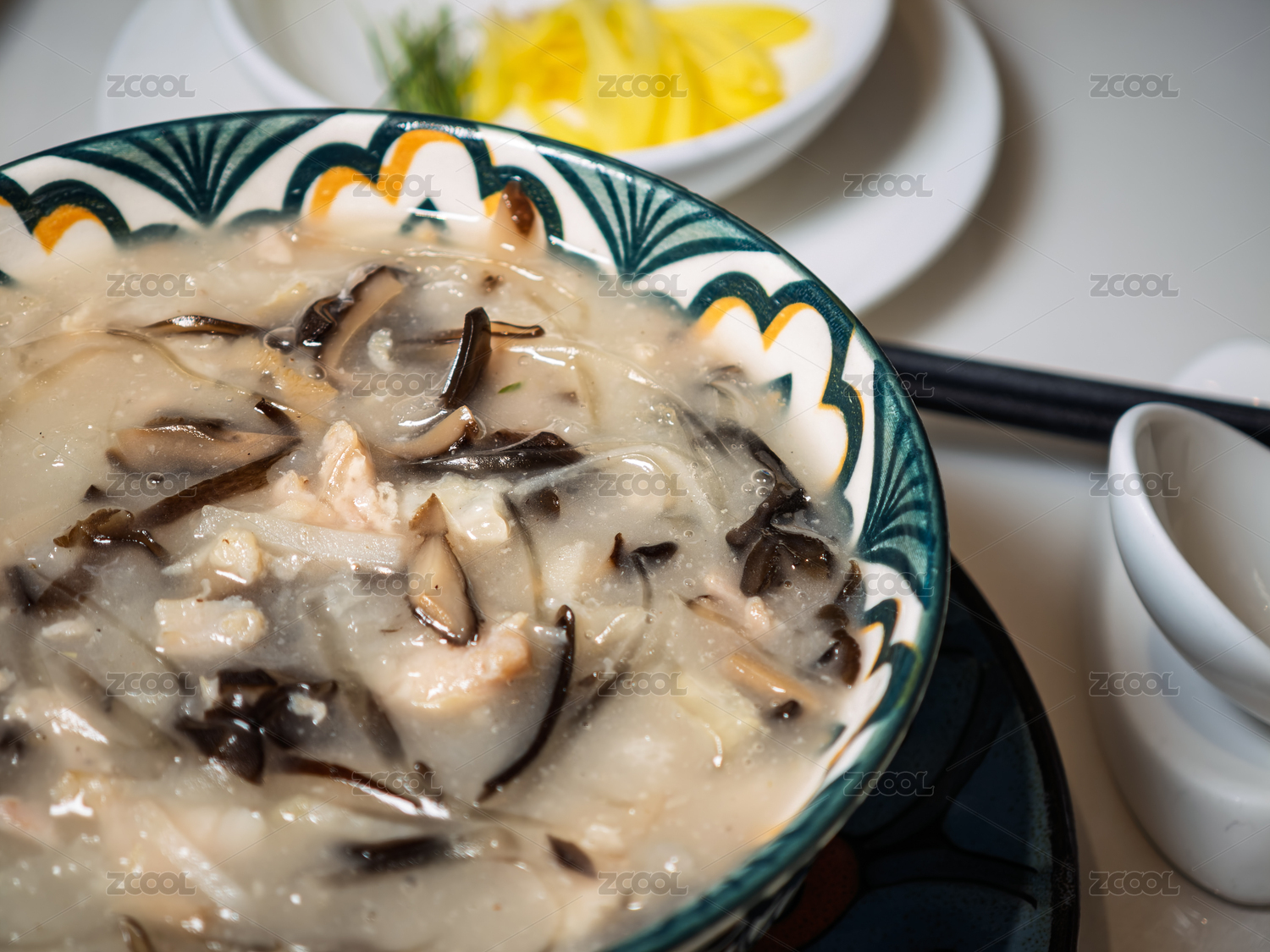 放在白色桌面上的中國廣東風(fēng)味美食——一碟牛雜,一碗清湯和一份辣醬