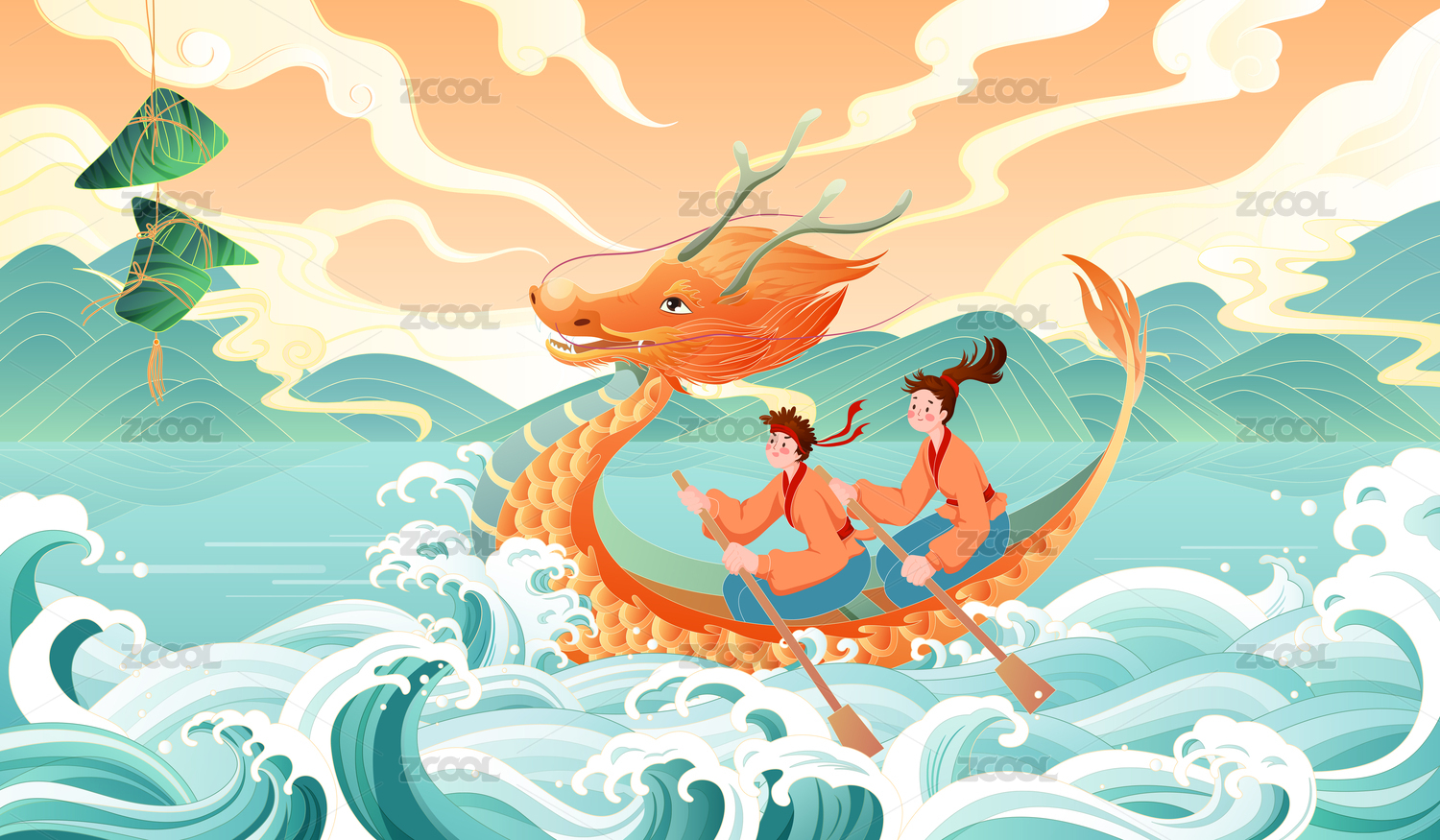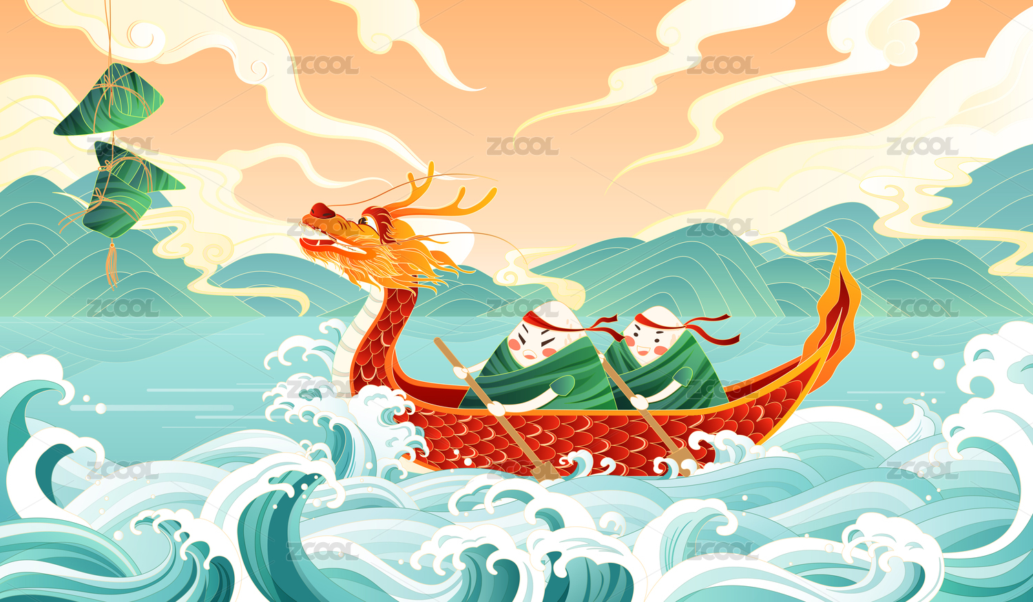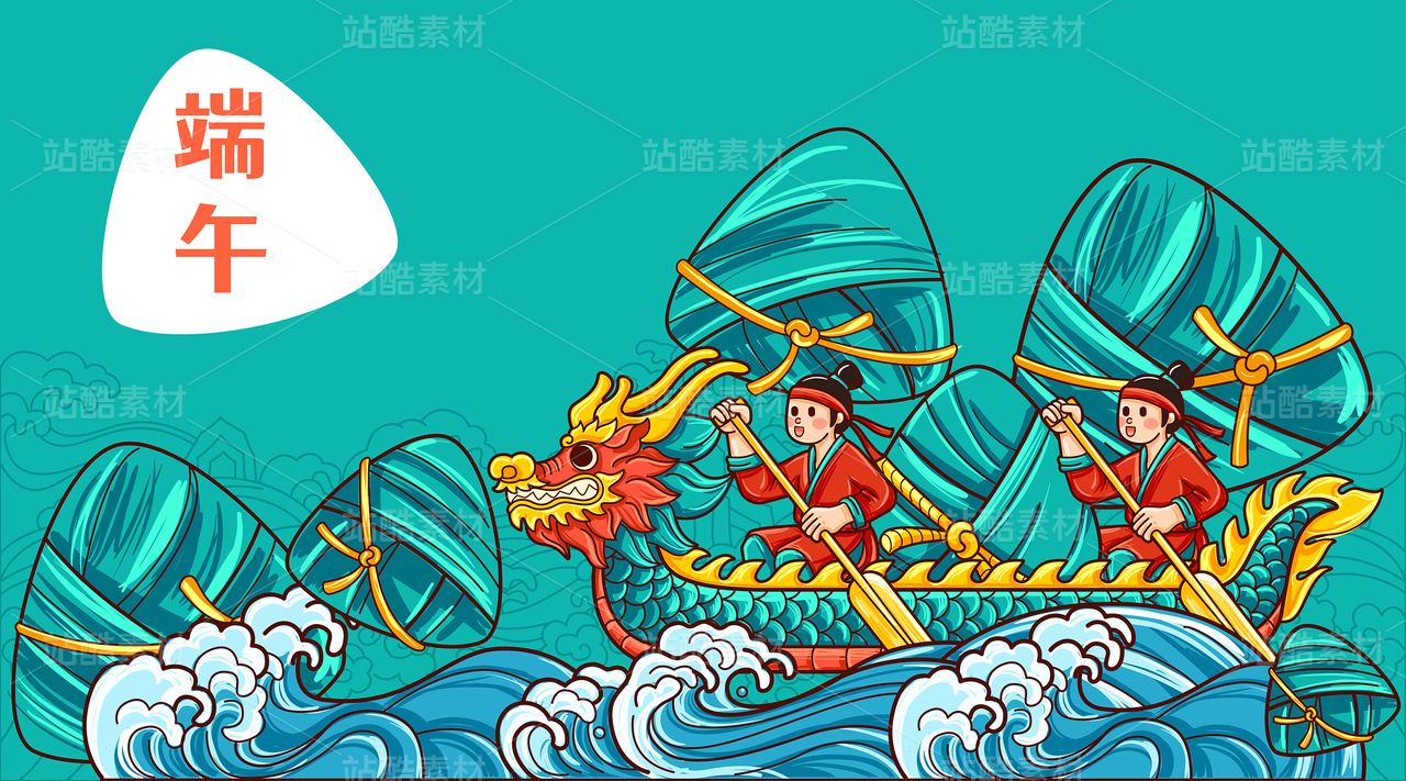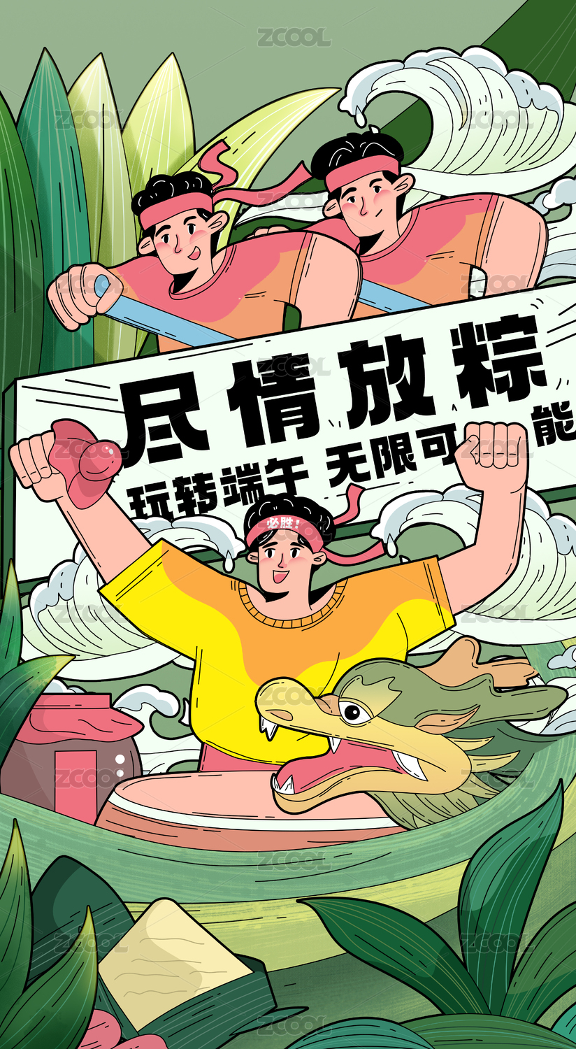 端午節(jié)劃龍舟浪花插畫傳統(tǒng)國潮節(jié)日粽子海報