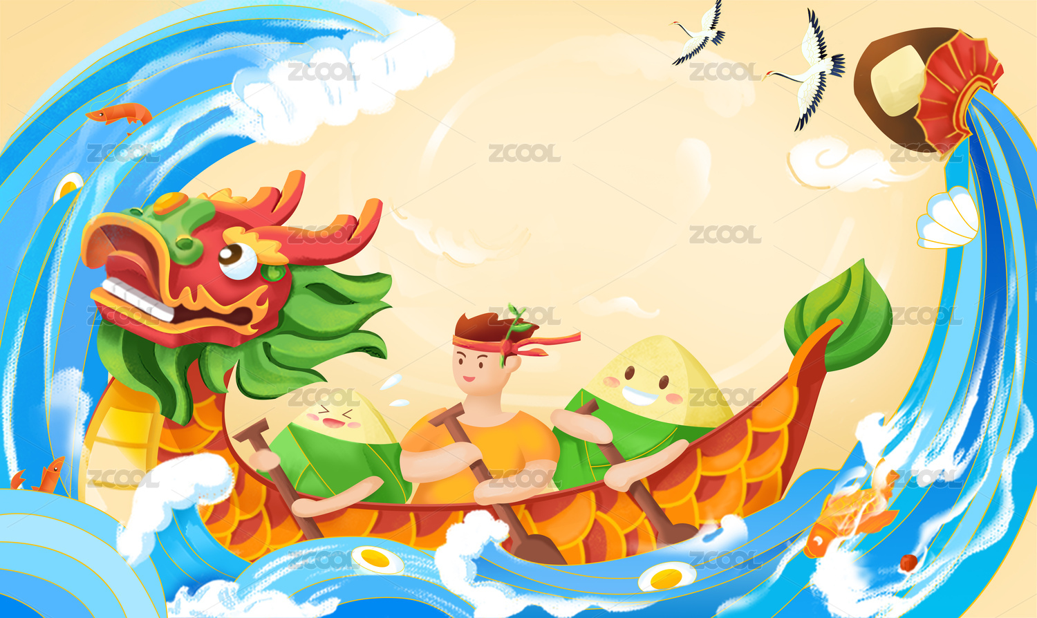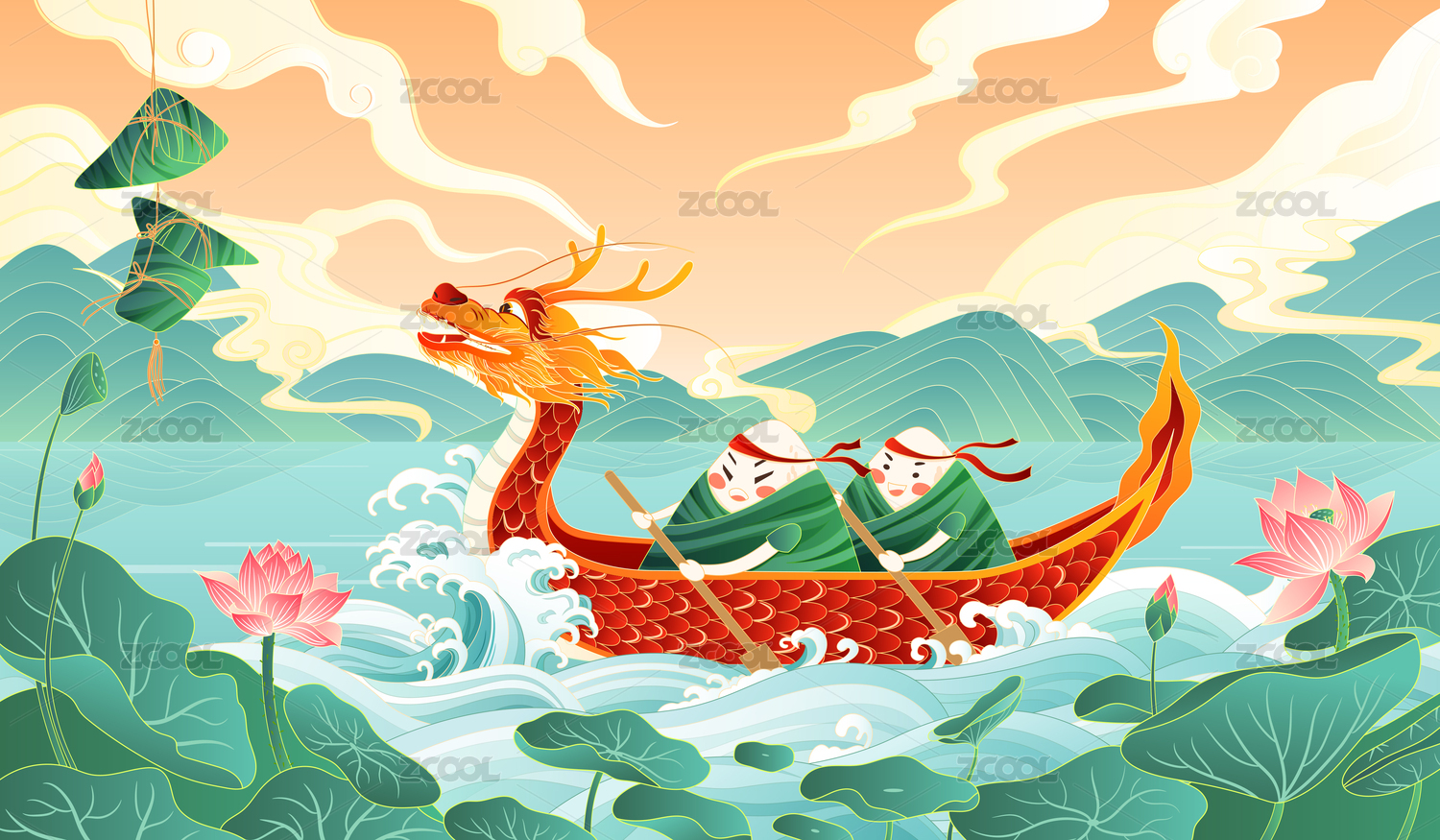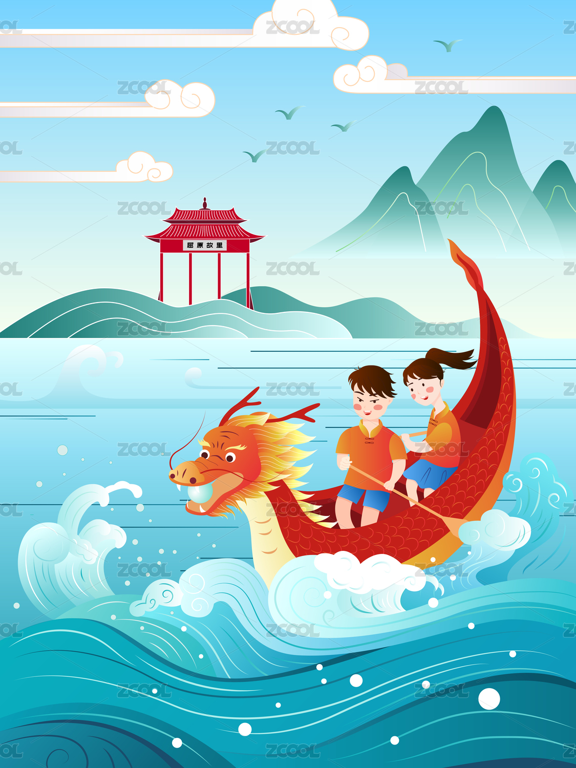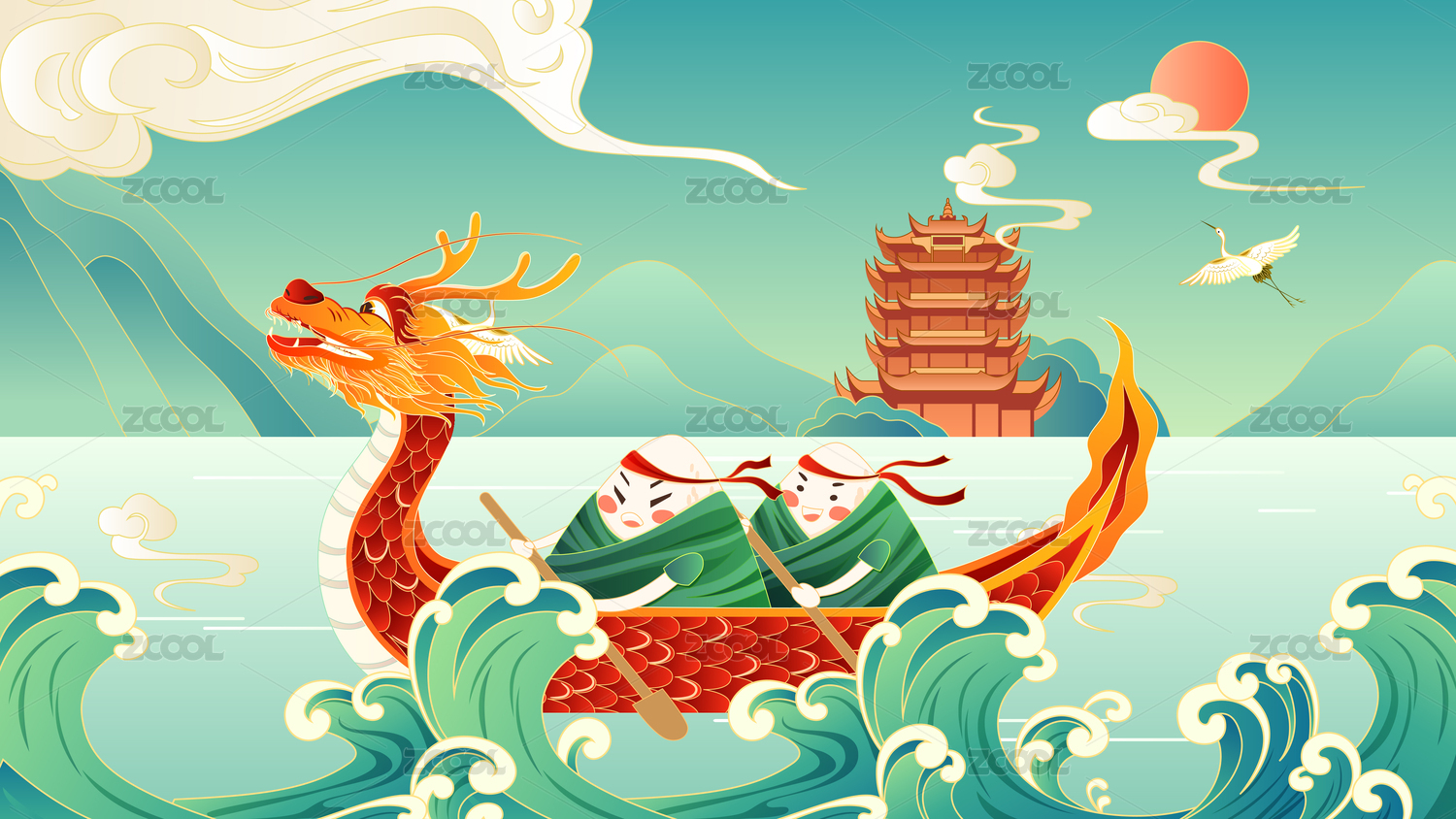 端午節(jié)劃龍舟浪花插畫傳統(tǒng)國潮節(jié)日粽子海報