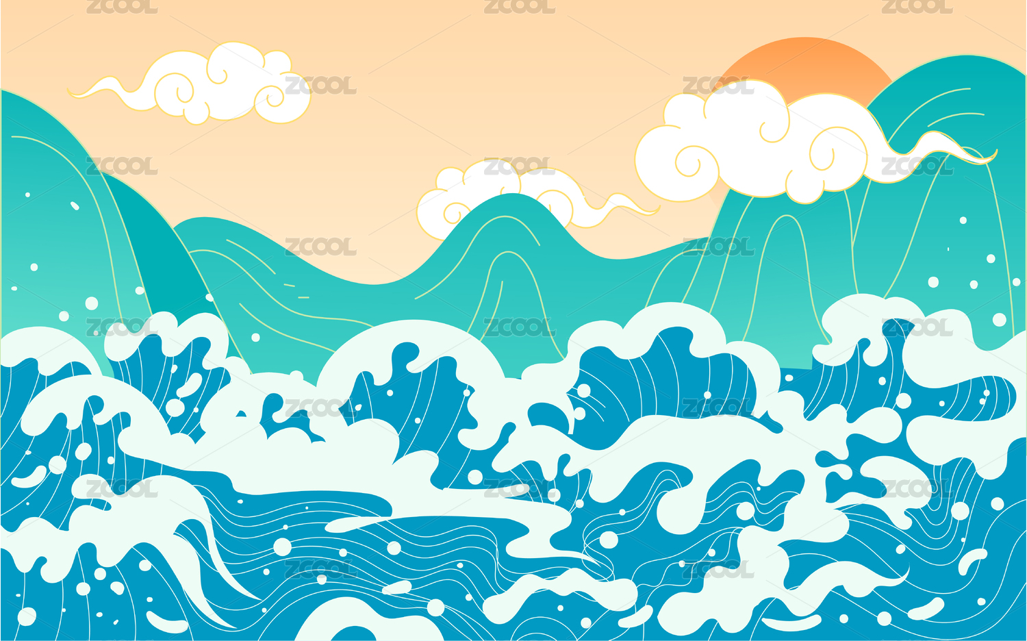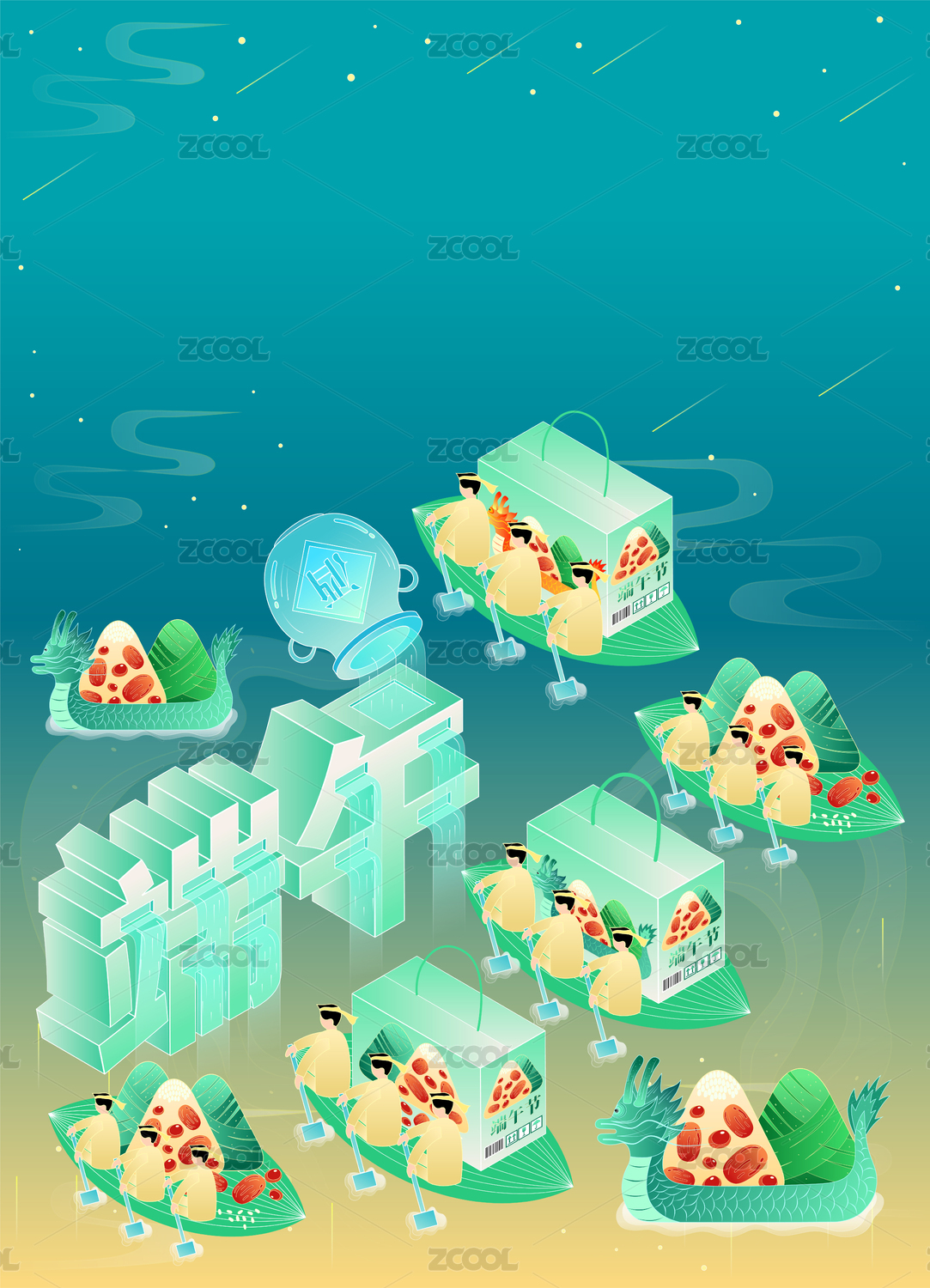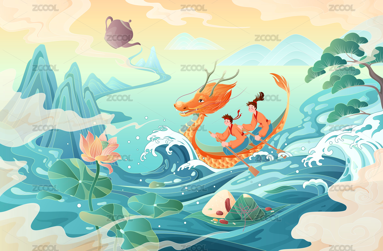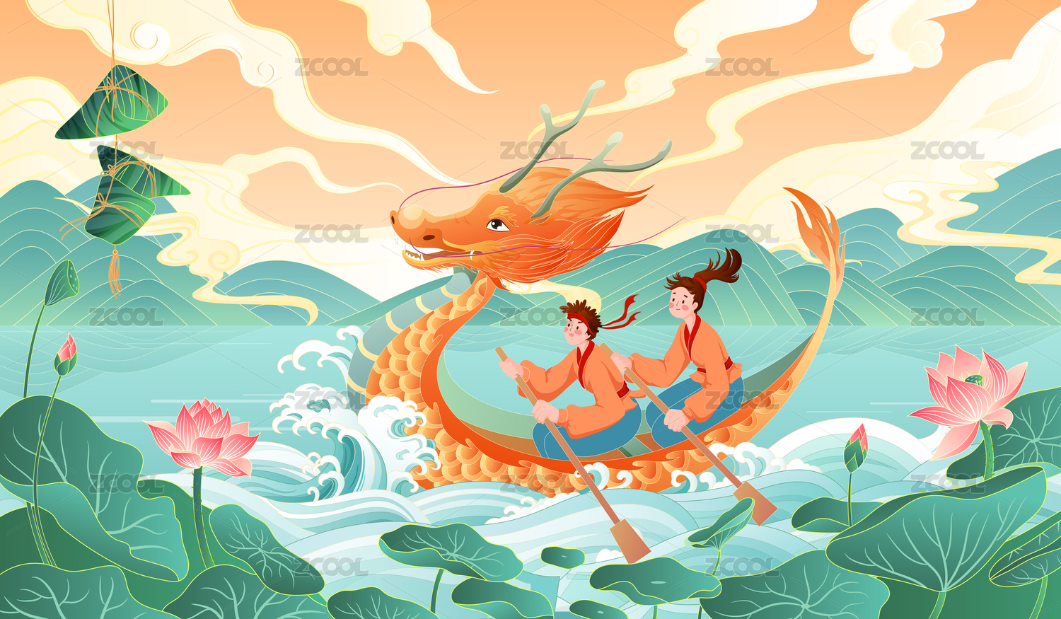 端午節(jié)劃龍舟浪花插畫傳統(tǒng)國潮節(jié)日粽子海報