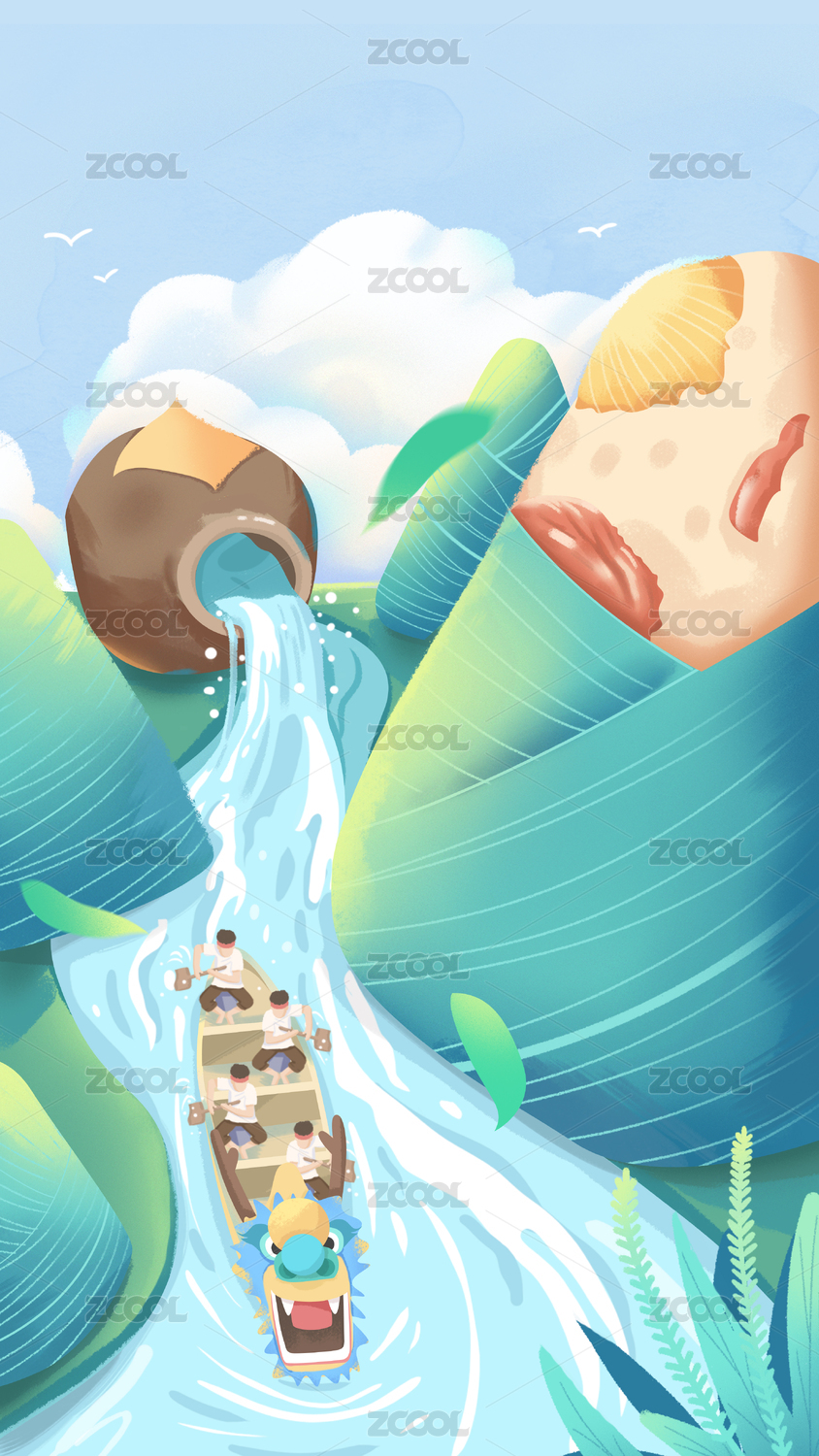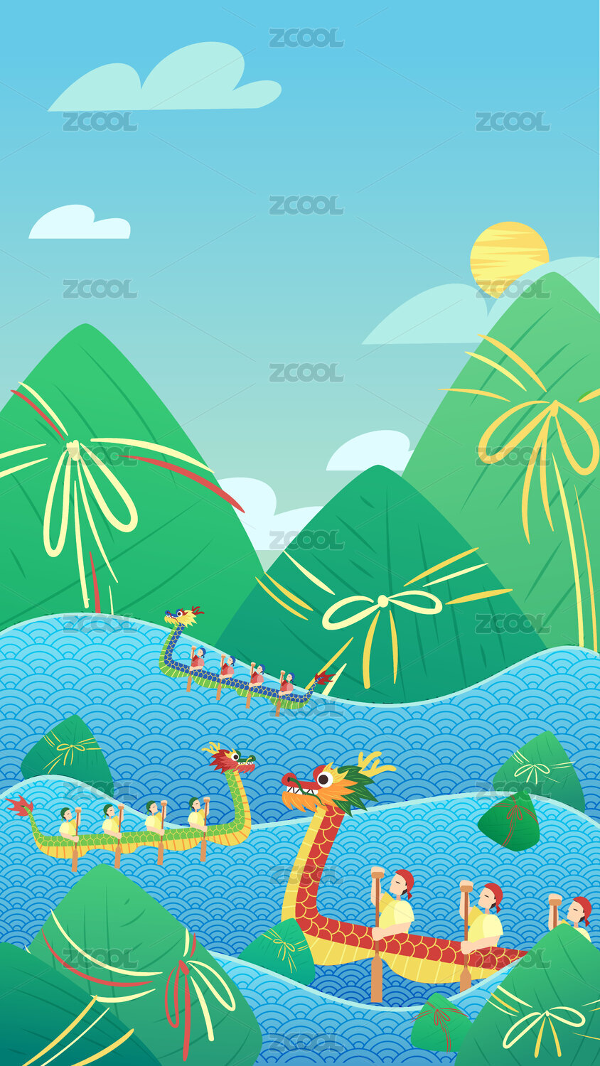 端午節(jié)粽子劃龍舟國潮插畫豎版概念
