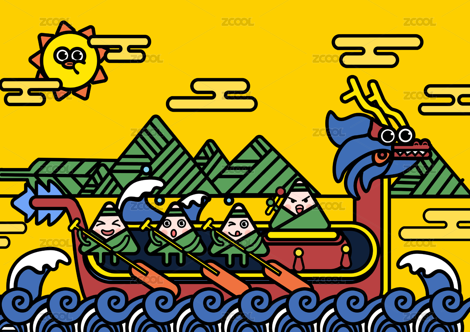 端午節(jié)劃龍舟浪花粽子國潮卡通插畫