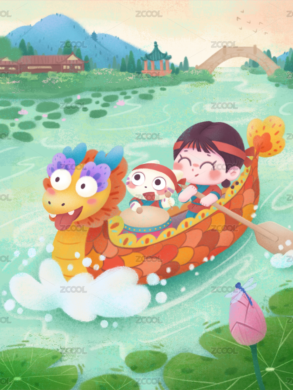 端午節(jié)小朋友劃龍舟載粽子國潮插畫概念