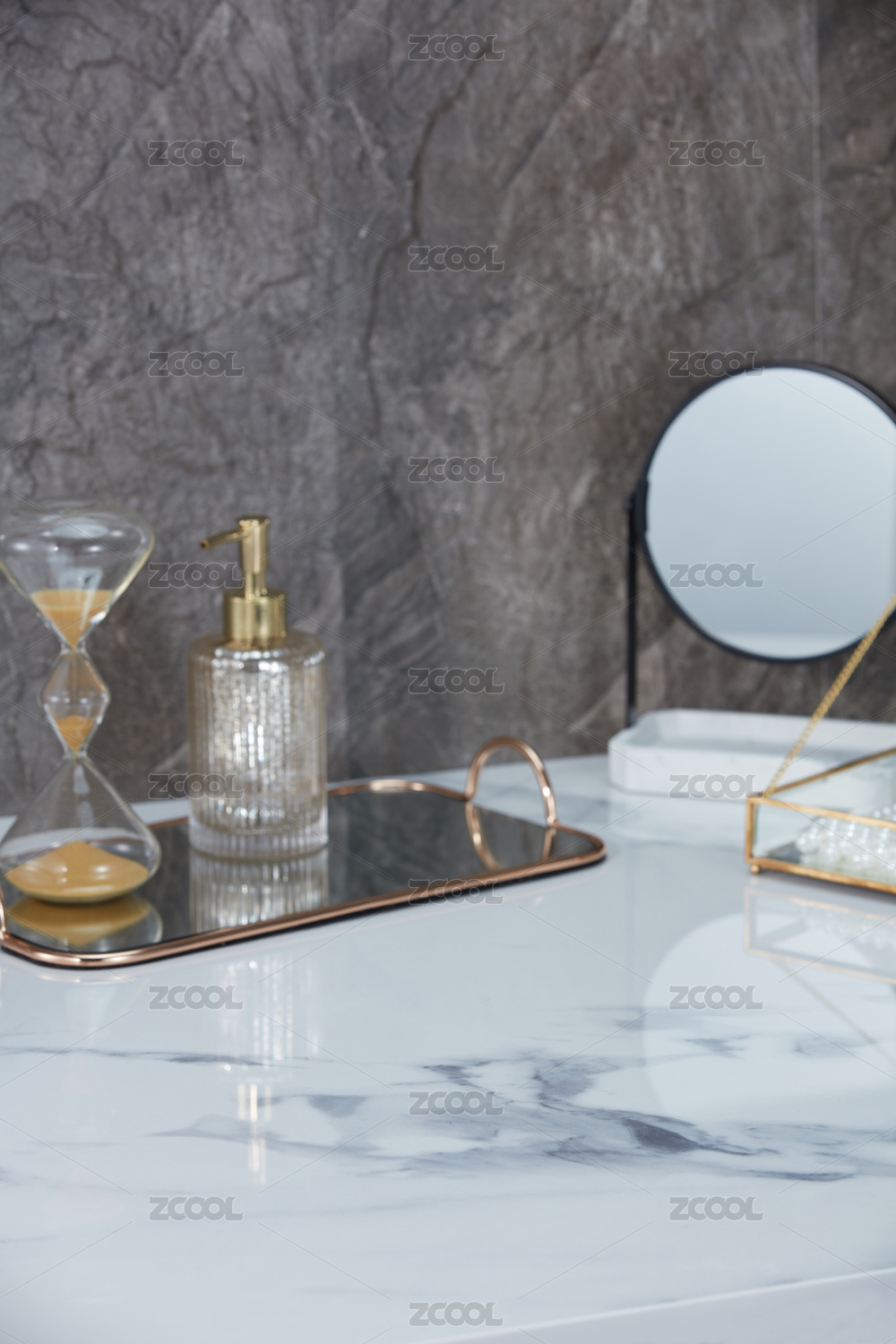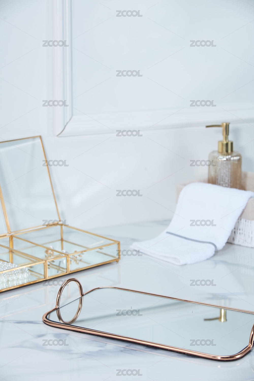 大理石桌上擺放著托盤(pán)首飾盒的法式居家場(chǎng)景