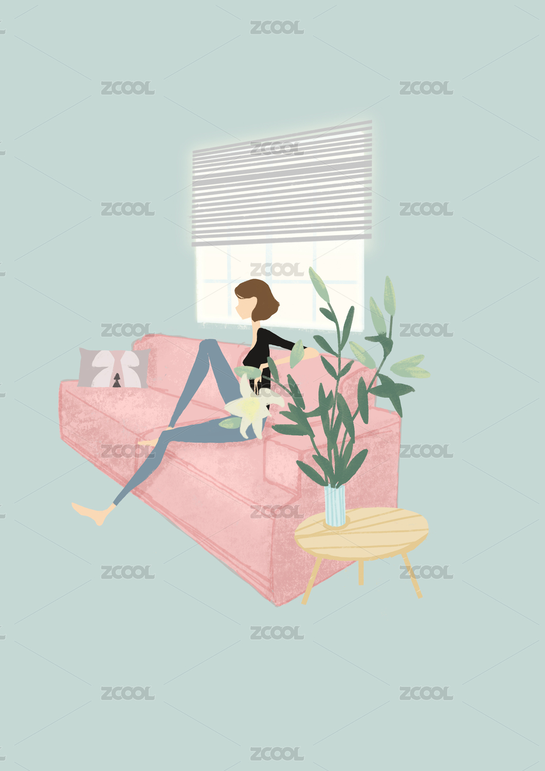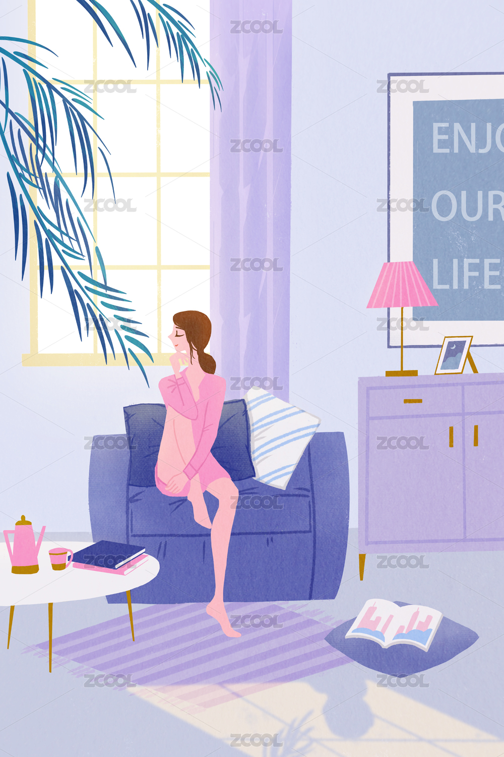 室內(nèi)居家場(chǎng)景坐沙發(fā)上休息的女孩插畫(huà)背景