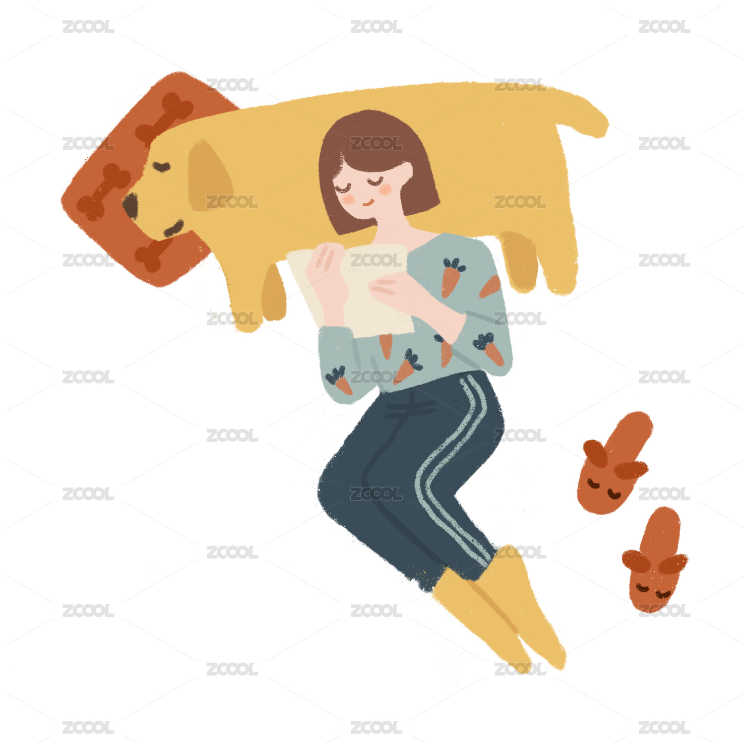 可愛(ài)女孩枕著寵物狗看書(shū)溫馨居家場(chǎng)景插畫(huà)