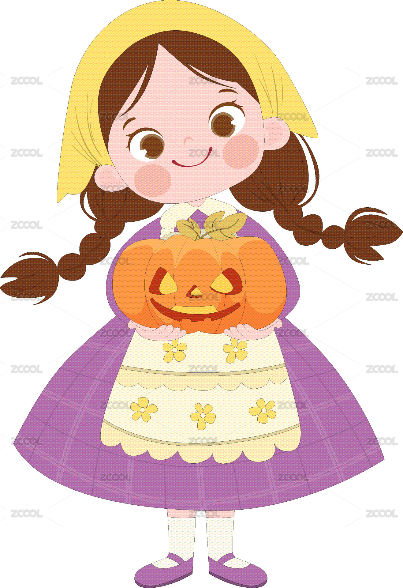 卡通風可愛穿泡泡裙女孩拿著南瓜燈兒童插畫
