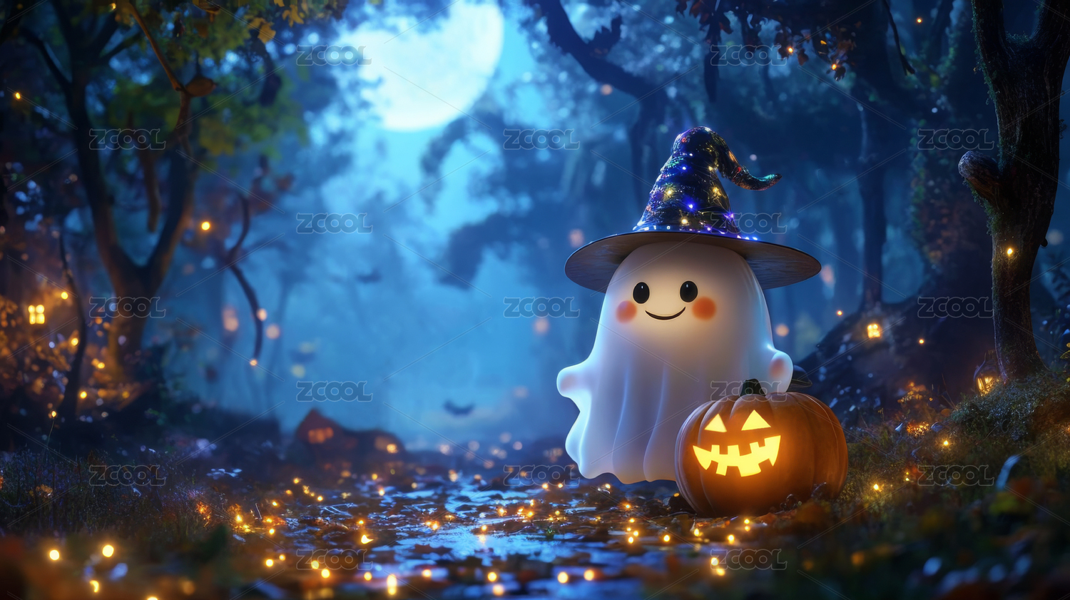 萬圣節(jié)森林里的卡通幽靈和南瓜燈
