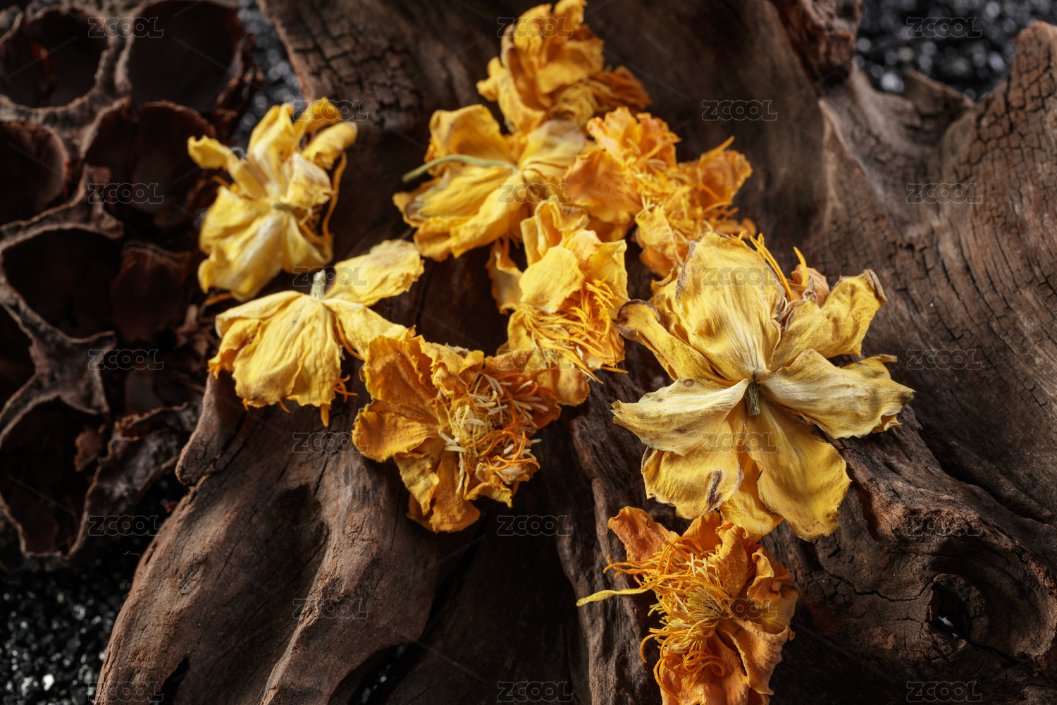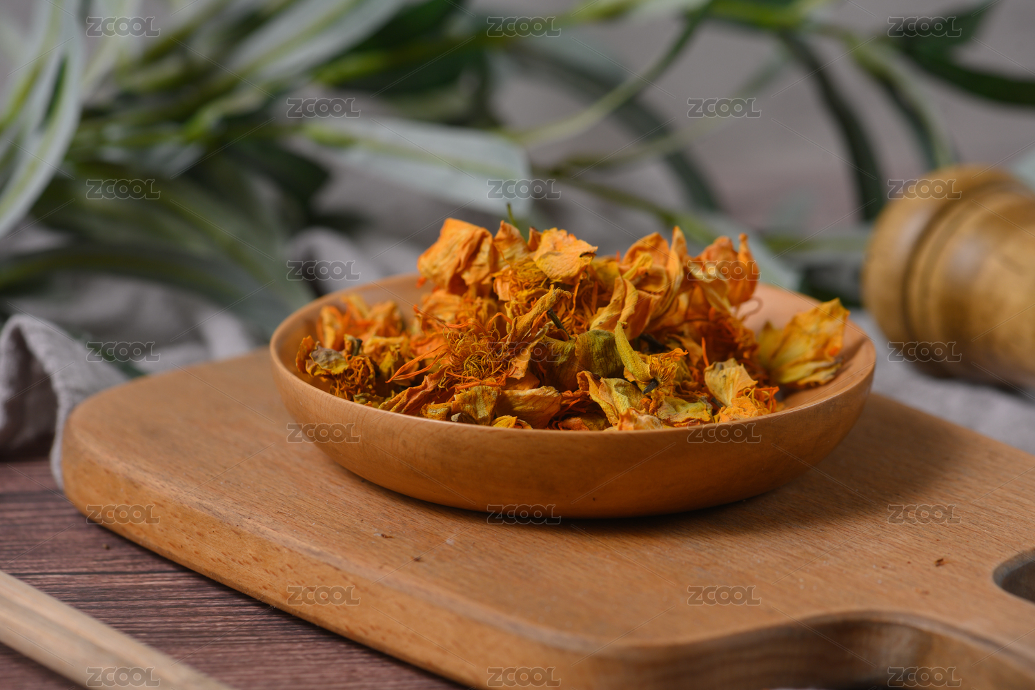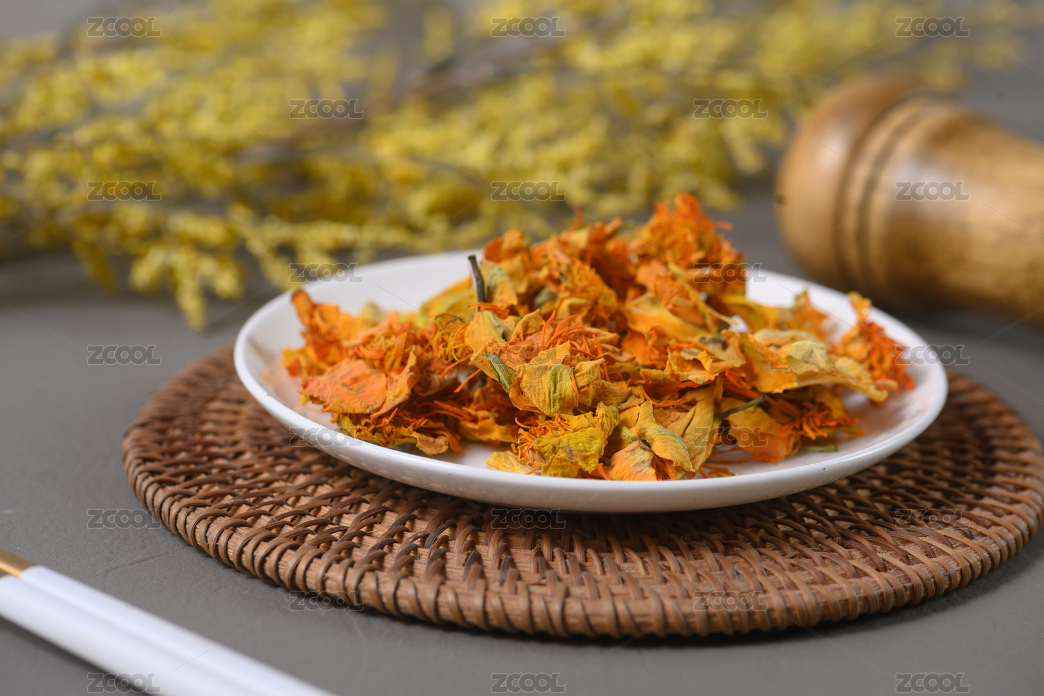 復(fù)雜背景上青花瓷碗裝的沽源特產(chǎn)金蓮花