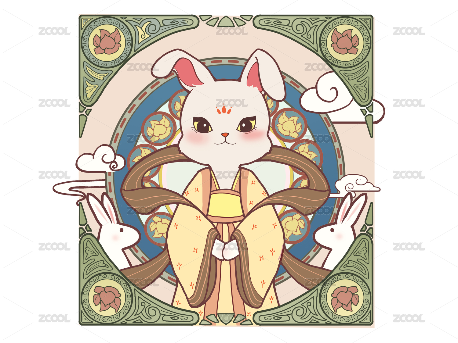 淡雅色卡通復(fù)古木刻質(zhì)感嫦娥兔元素