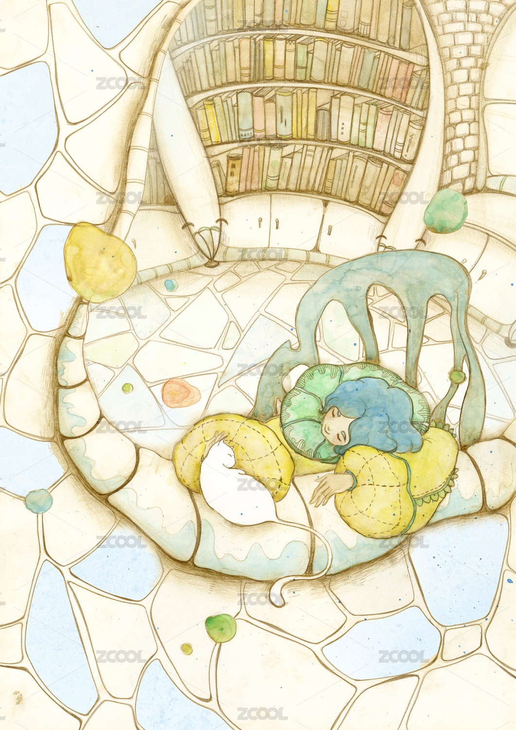 一個(gè)女孩和一只貓?jiān)跁坷锸掷L插畫作品