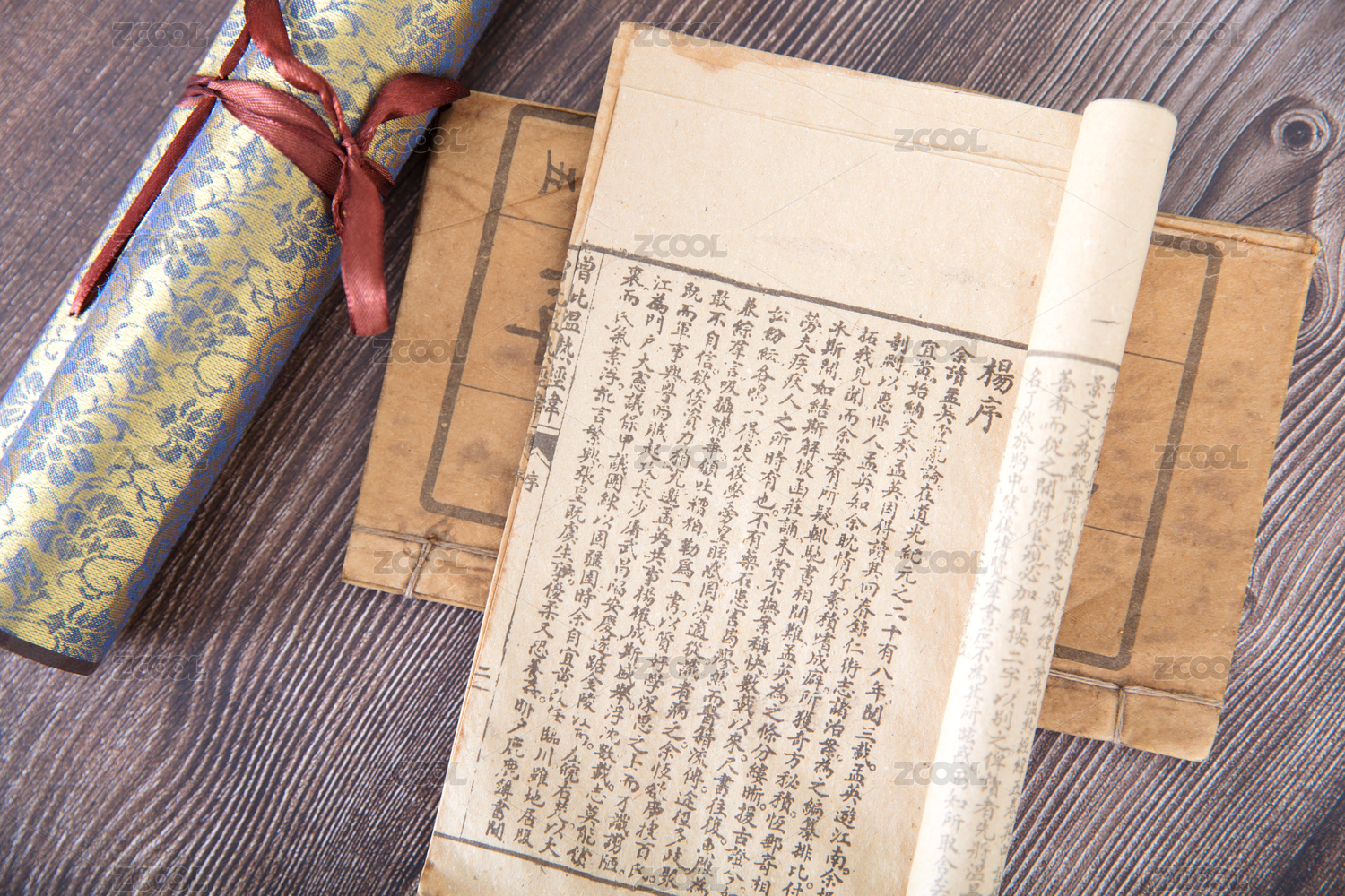 放好的毛筆和古書籍及旁邊卷軸書畫作品