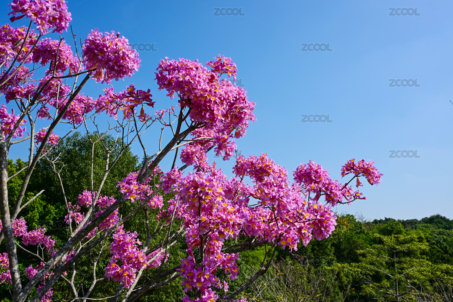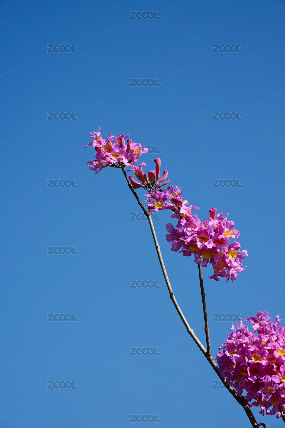 藍(lán)天下盛開的粉紫色風(fēng)鈴木特寫