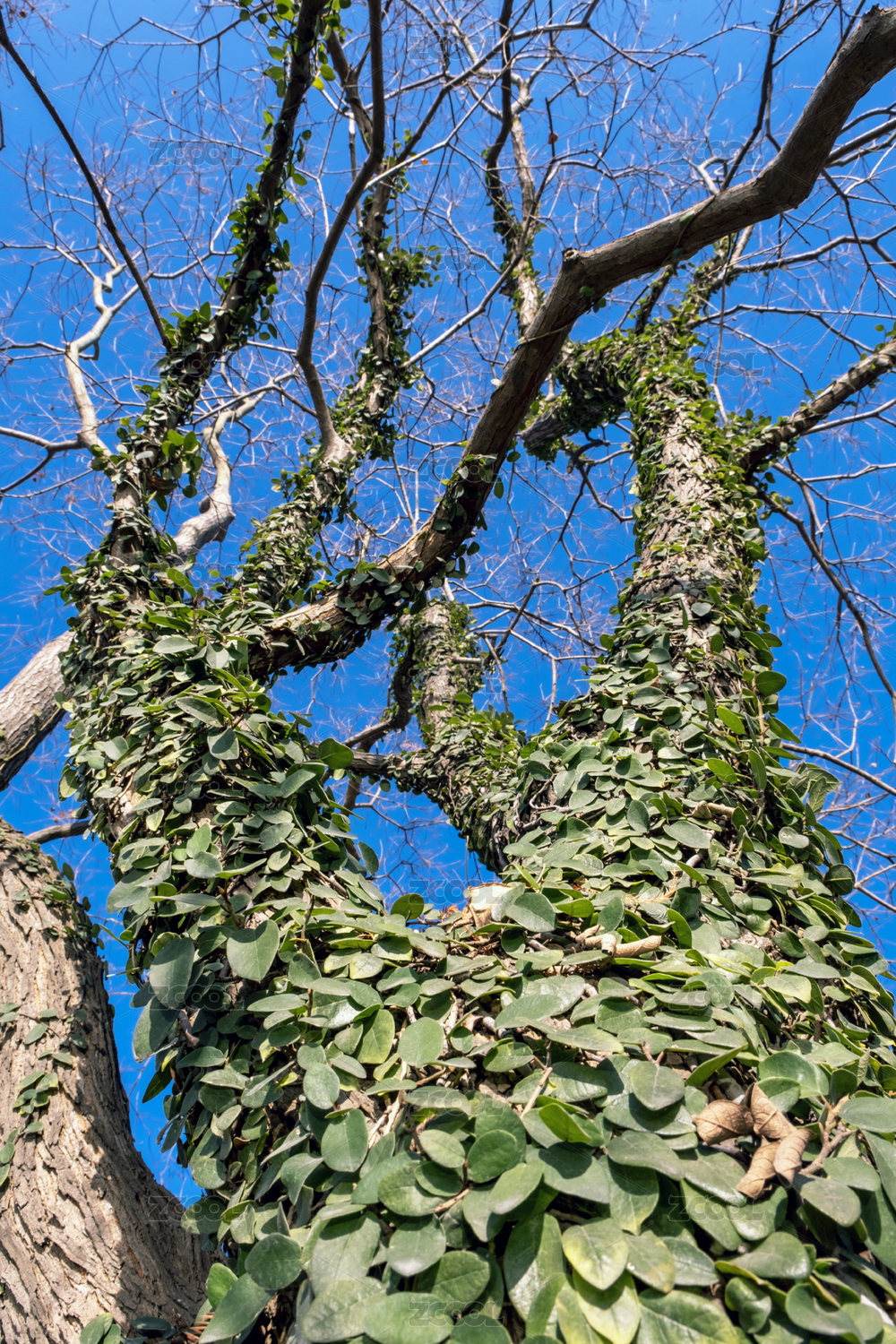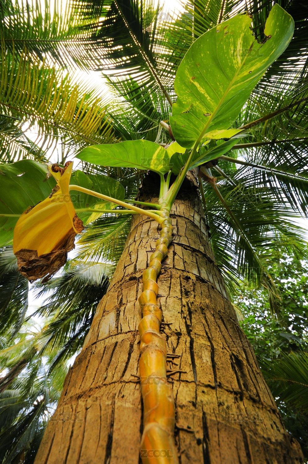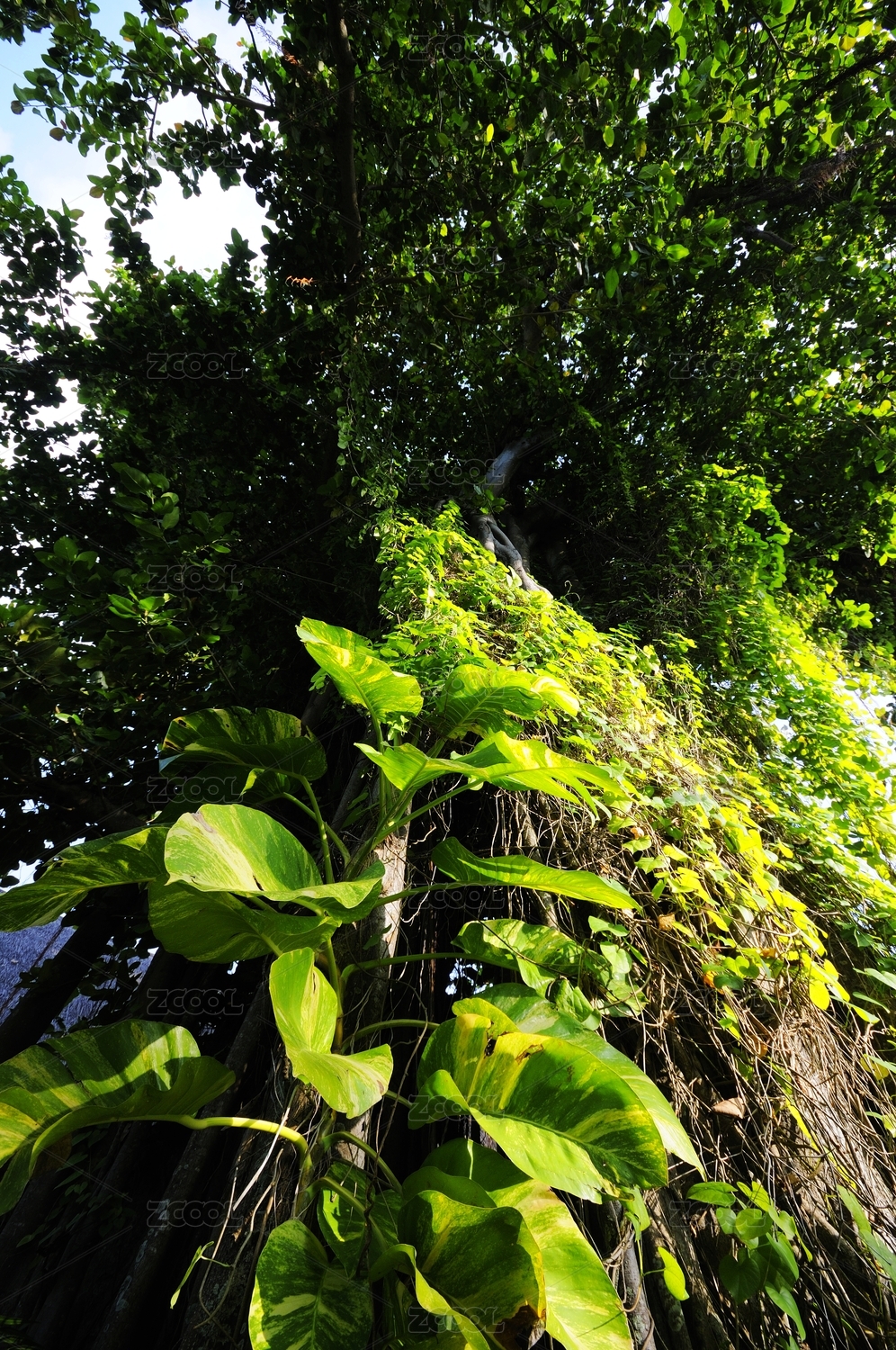 馬爾代夫,長(zhǎng)滿藤蔓植物樹(shù)干的仰視特寫(xiě)