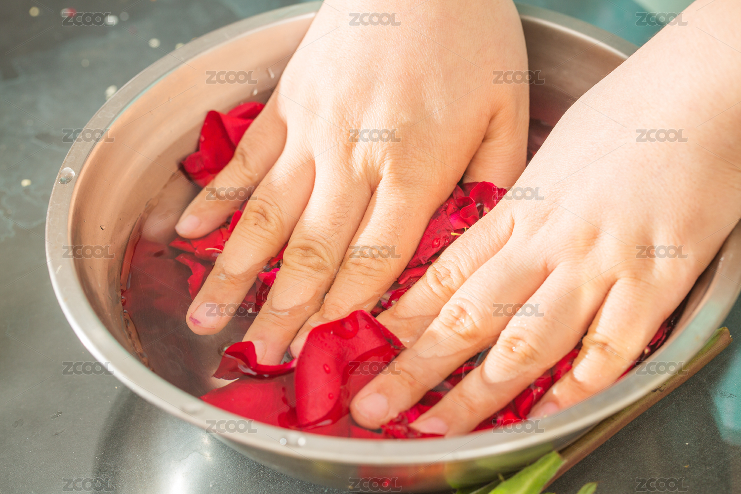 浸泡在不銹鋼盆里的食用玫瑰花瓣