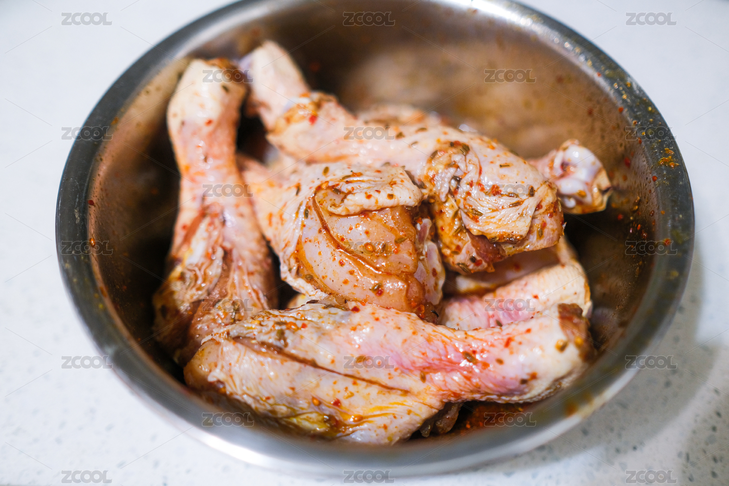 不銹鋼盆里裝著腌制的雞腿