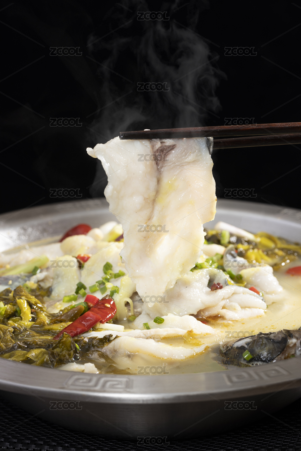 不銹鋼盆里夾子著的泡椒酸菜魚(yú)片