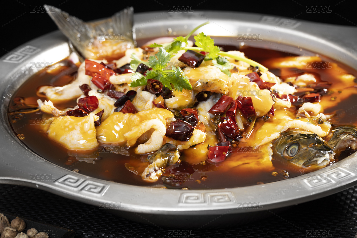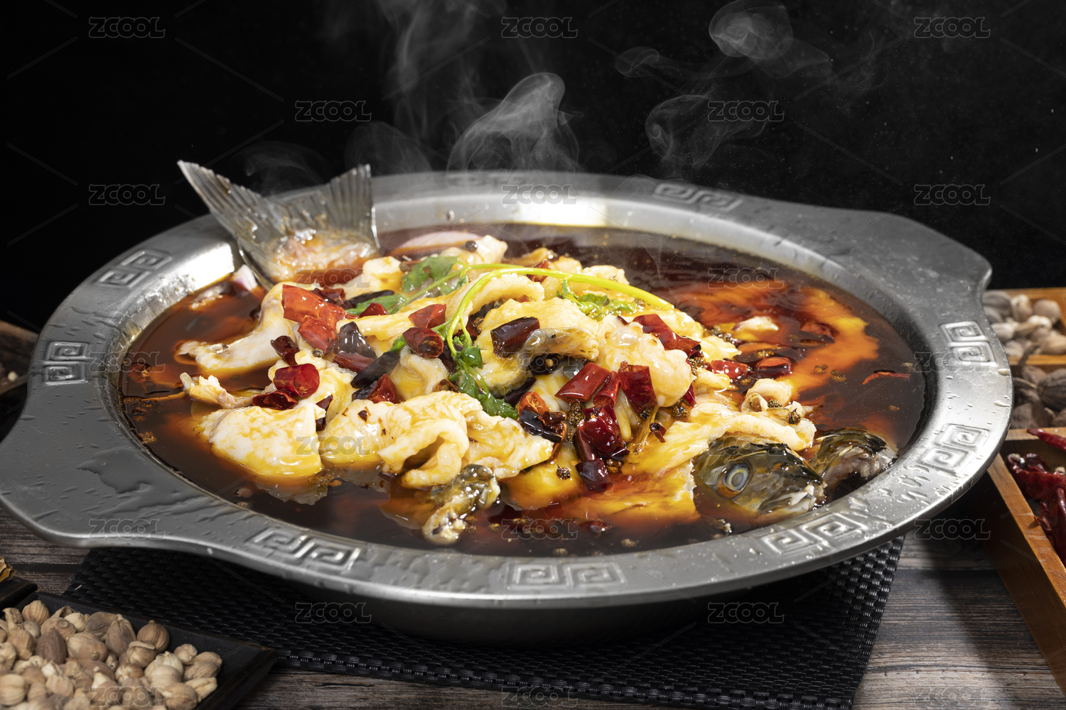 不銹鋼盆里的川菜麻辣水煮魚(yú)