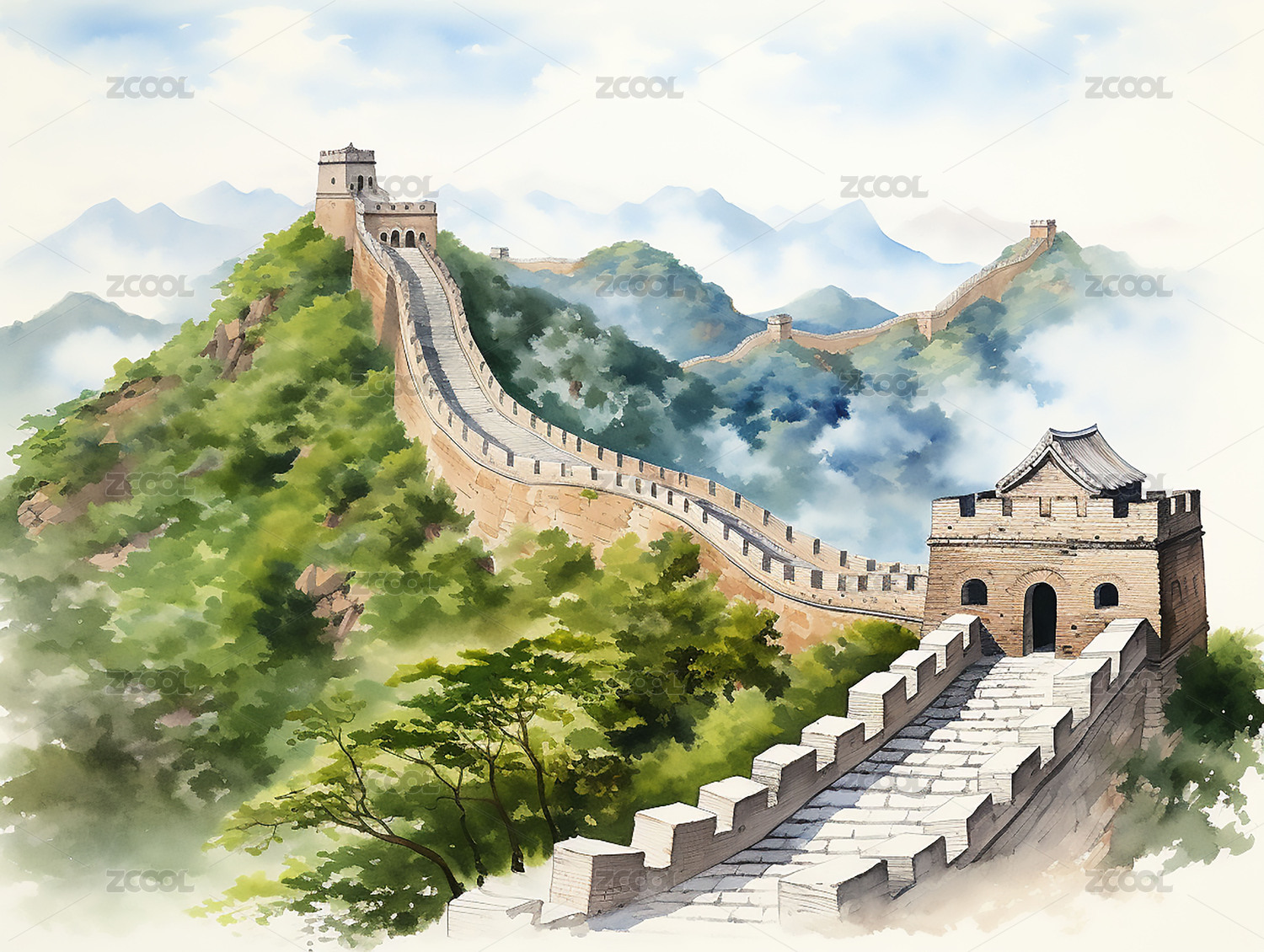 水彩風(fēng)萬里長城