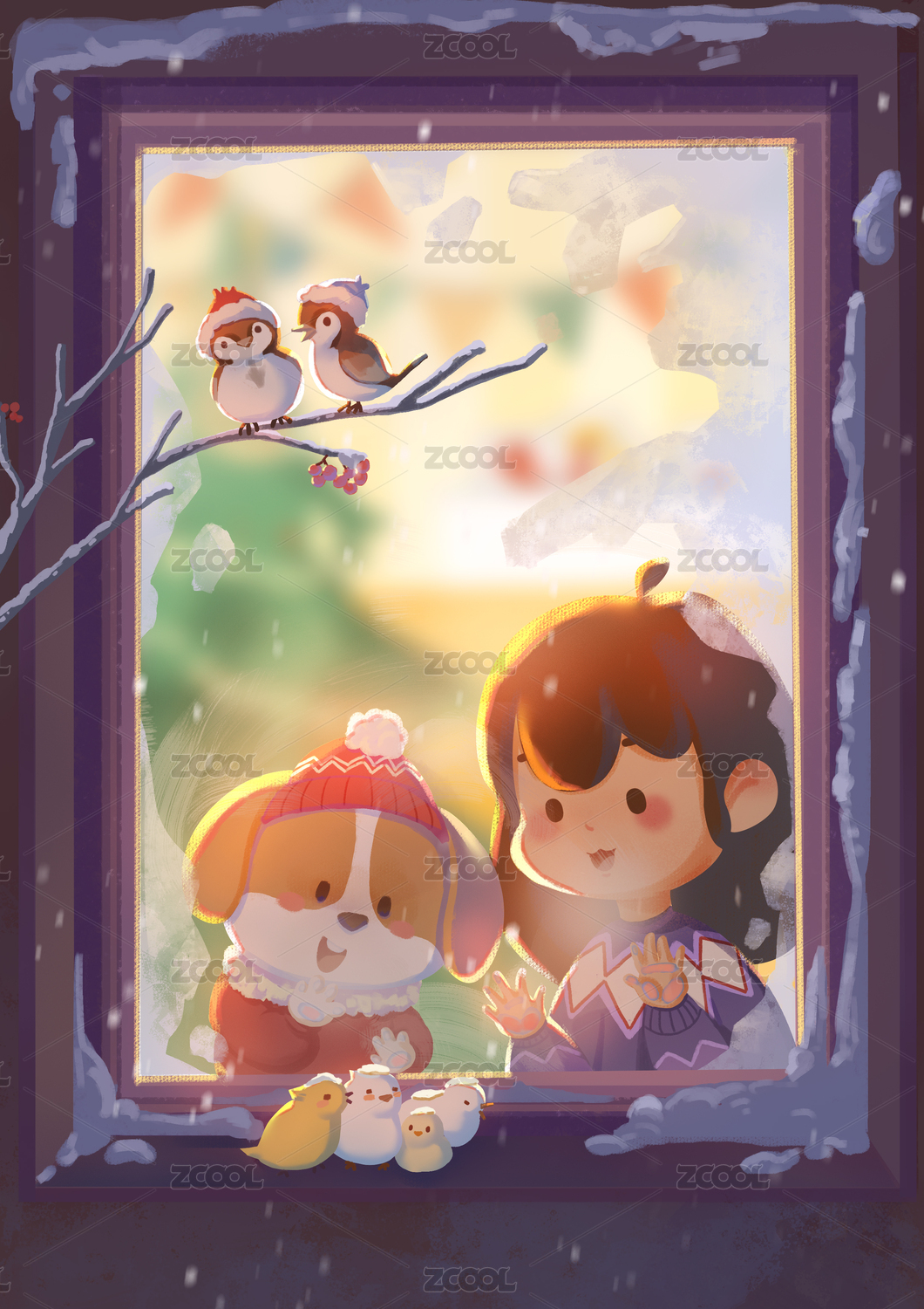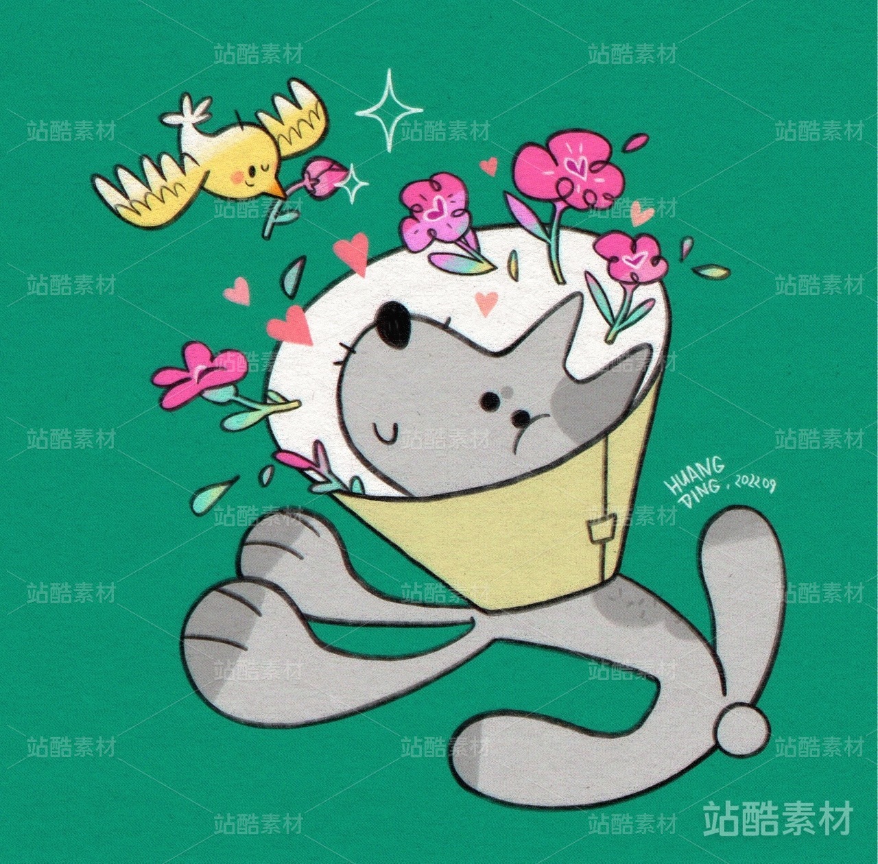 戴伊麗莎白圈的小狗和銜著鮮花的小鳥