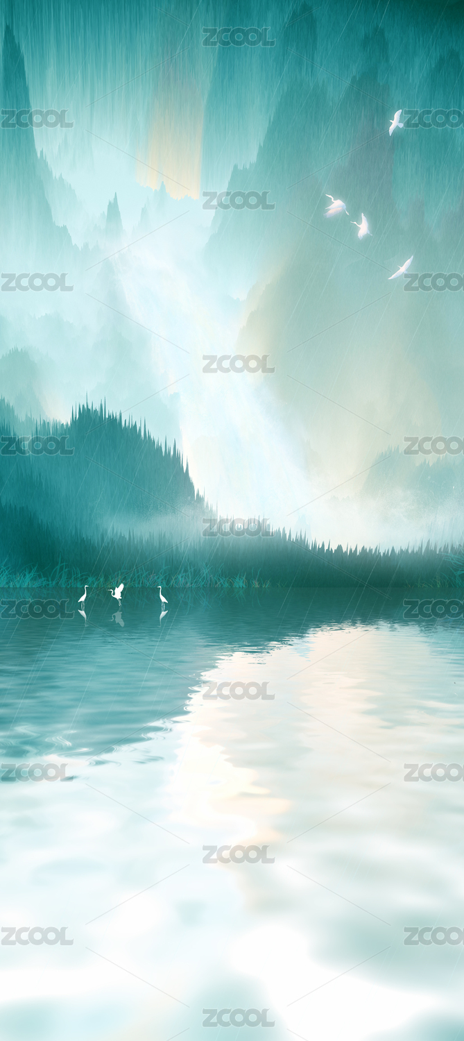 夏天小鳥飛過平靜的湖面,瀑布從山峰流下中國風插畫背景海報