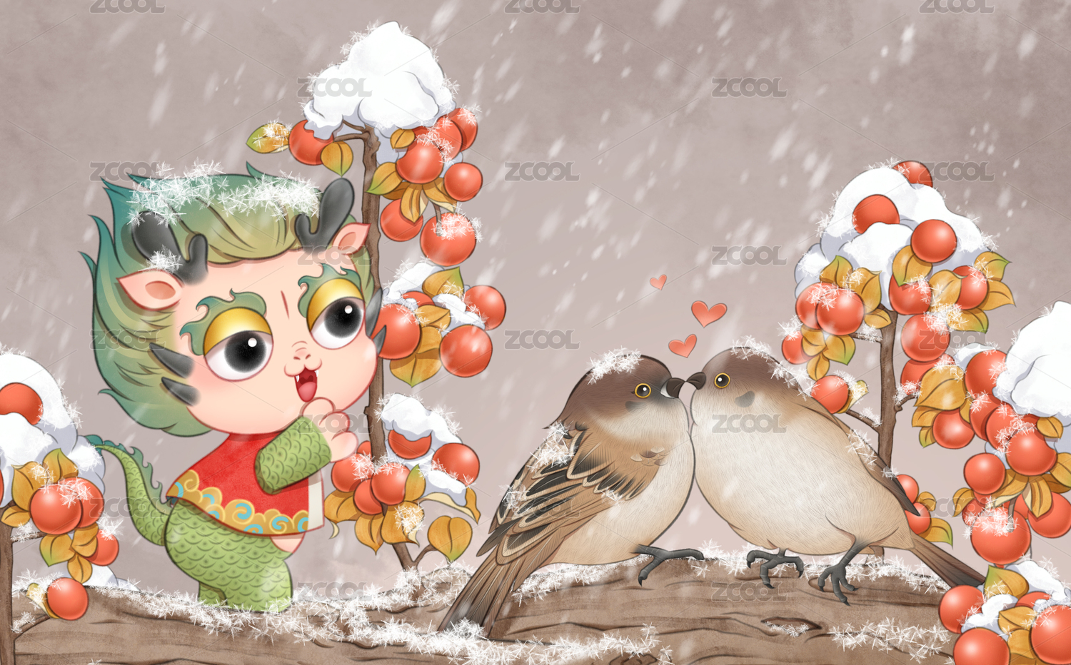 立冬龍寶躲在樹枝后看兩只小鳥秀恩愛