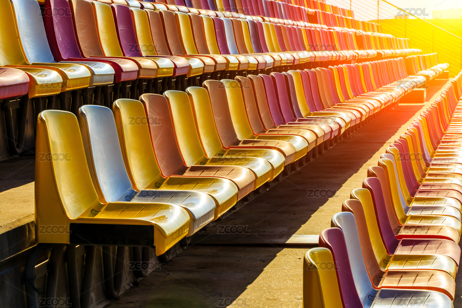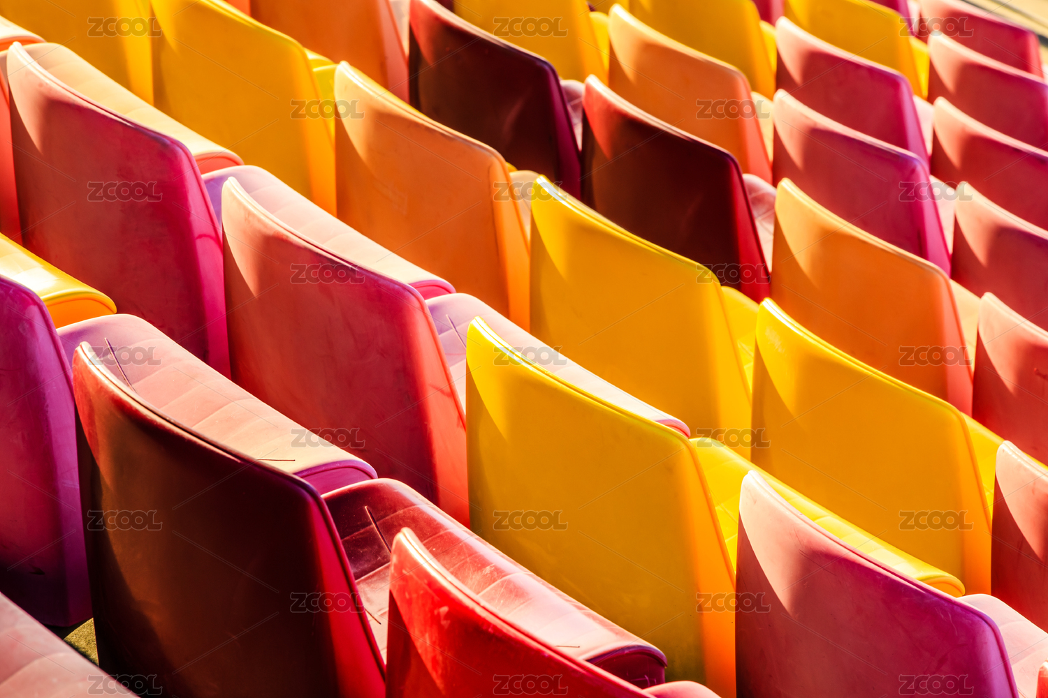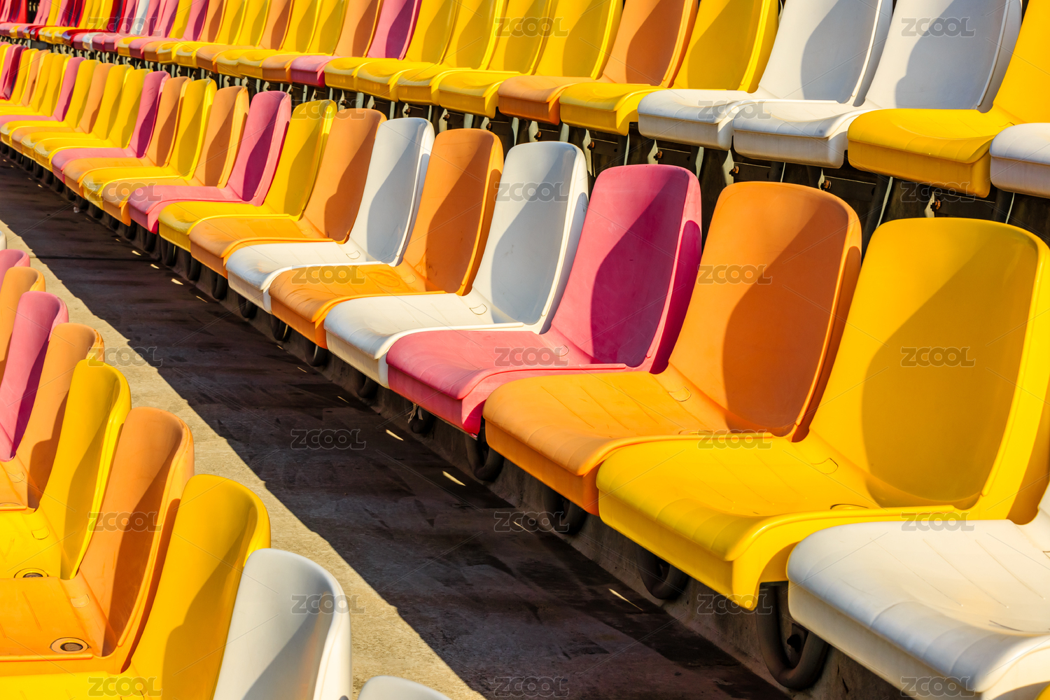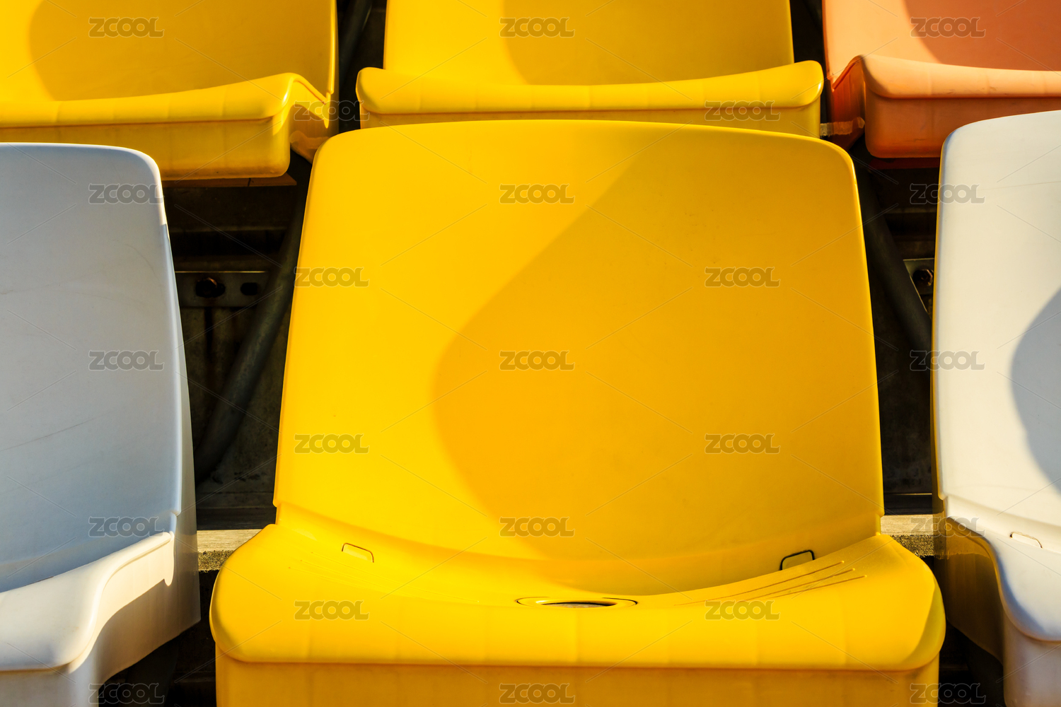 晴朗的白天體育場內(nèi)的空的塑料椅子