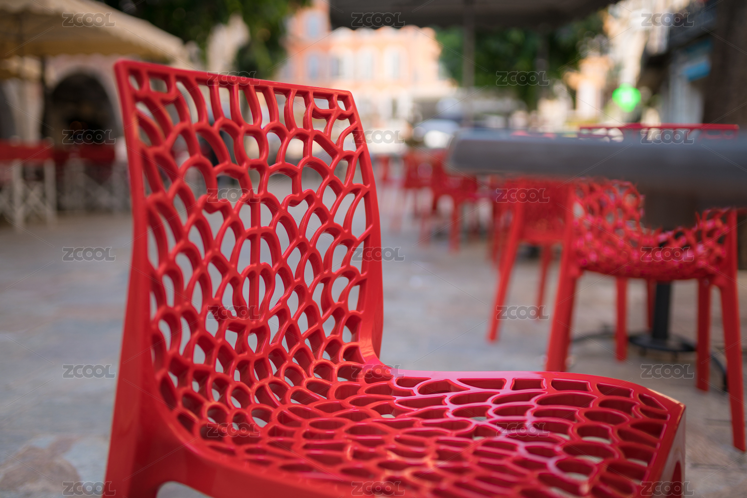 廣場上鏤空的紅色塑料椅子