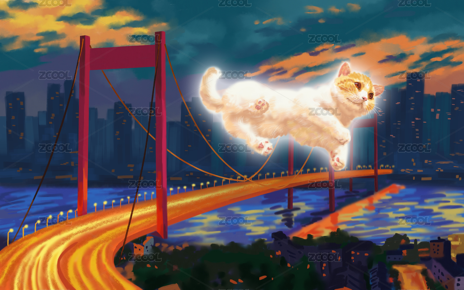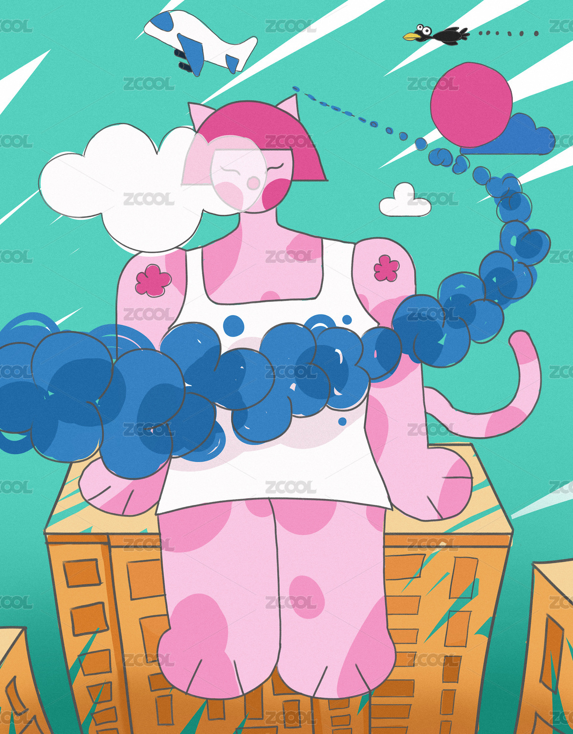 原創(chuàng)手繪城市上空自由飛翔的貓咪