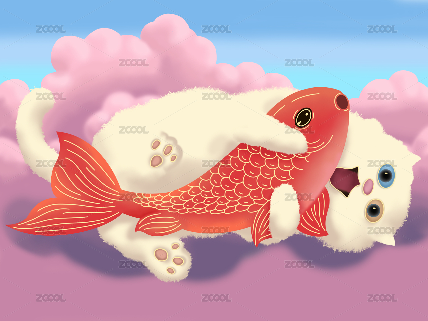 抱著紅色大魚的小貓咪