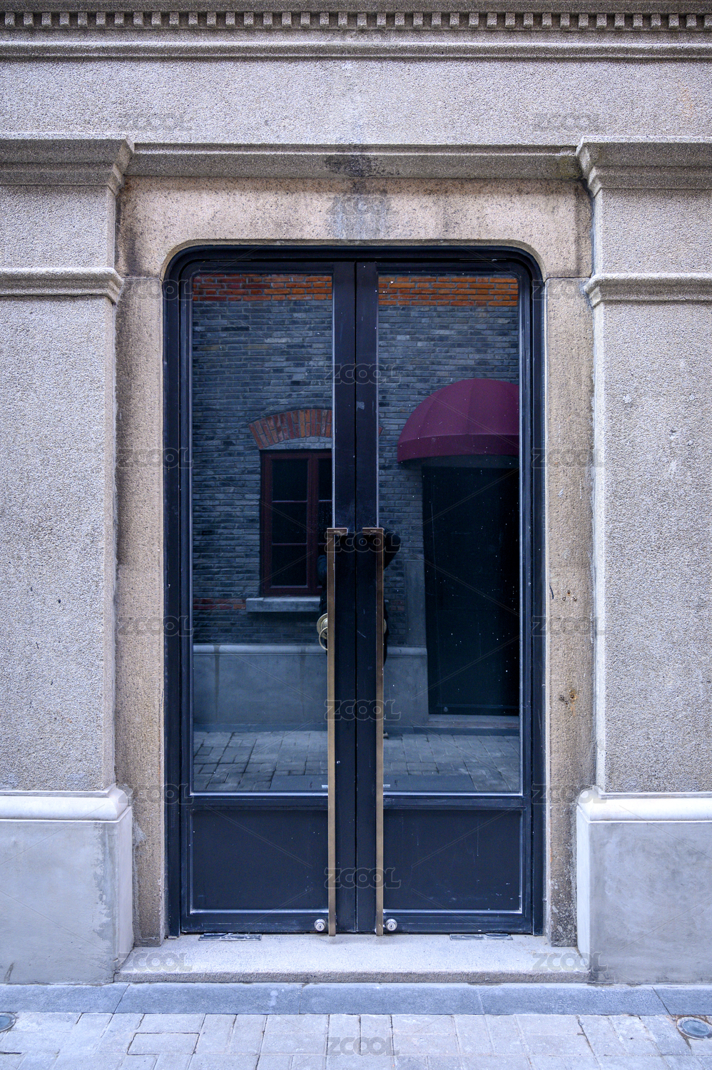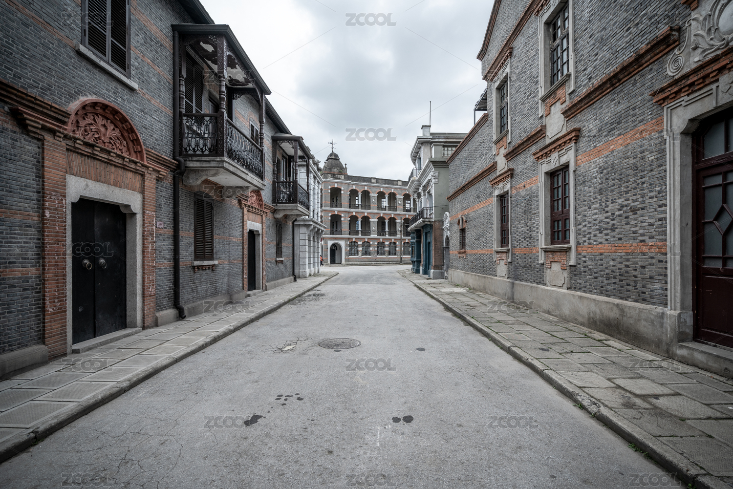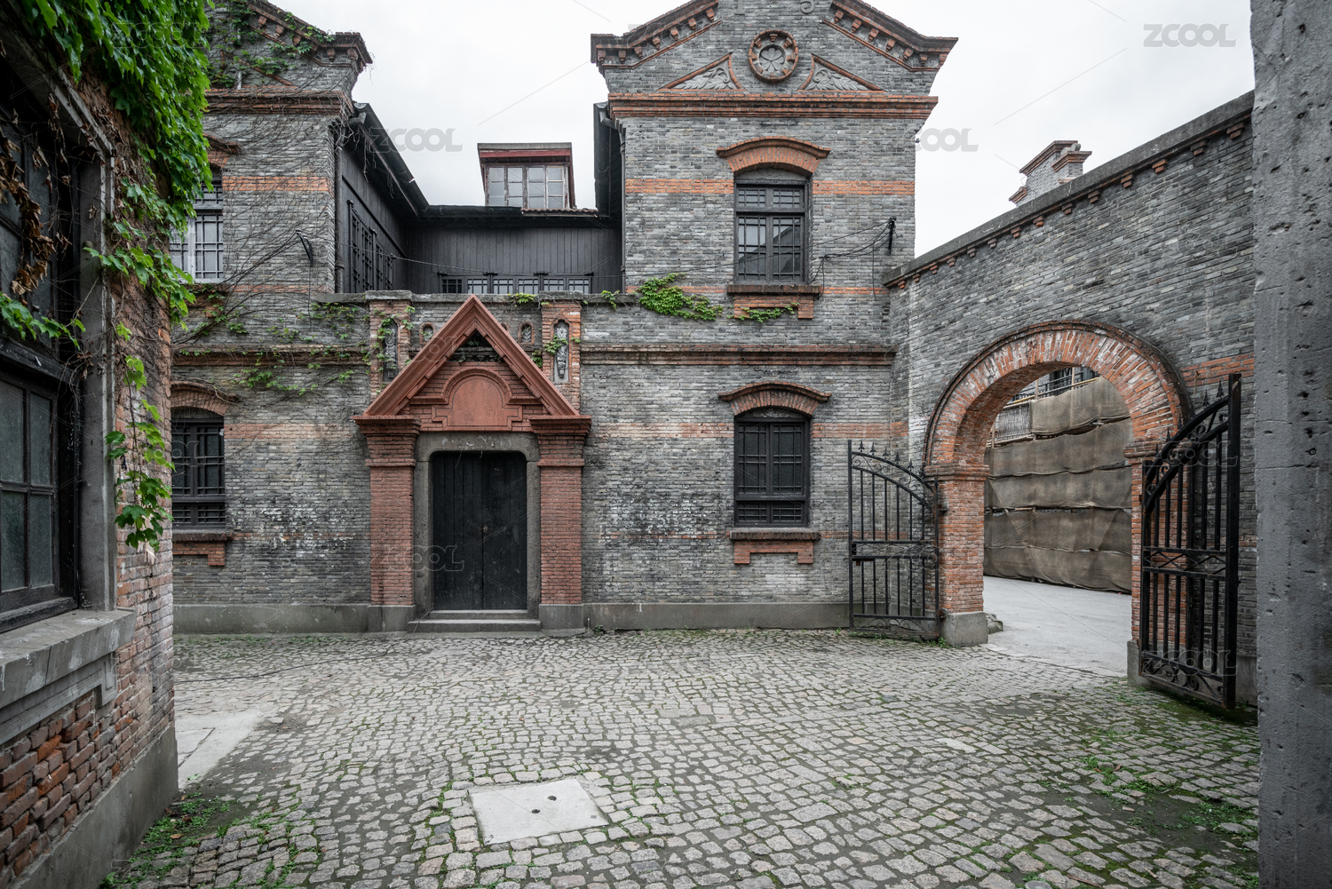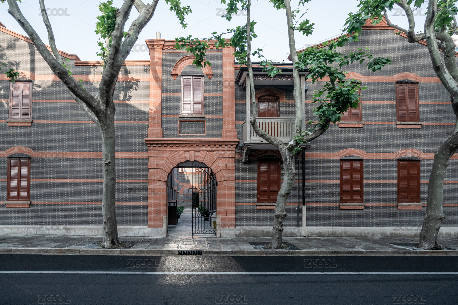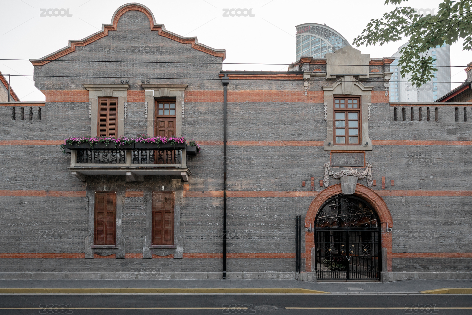 老上海的歐式紅磚老洋房外墻及大門特寫