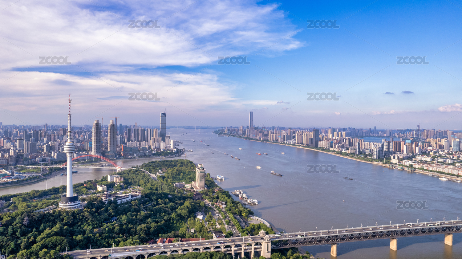 中國湖北武漢龜山電視塔和長江大橋晴天風(fēng)光
