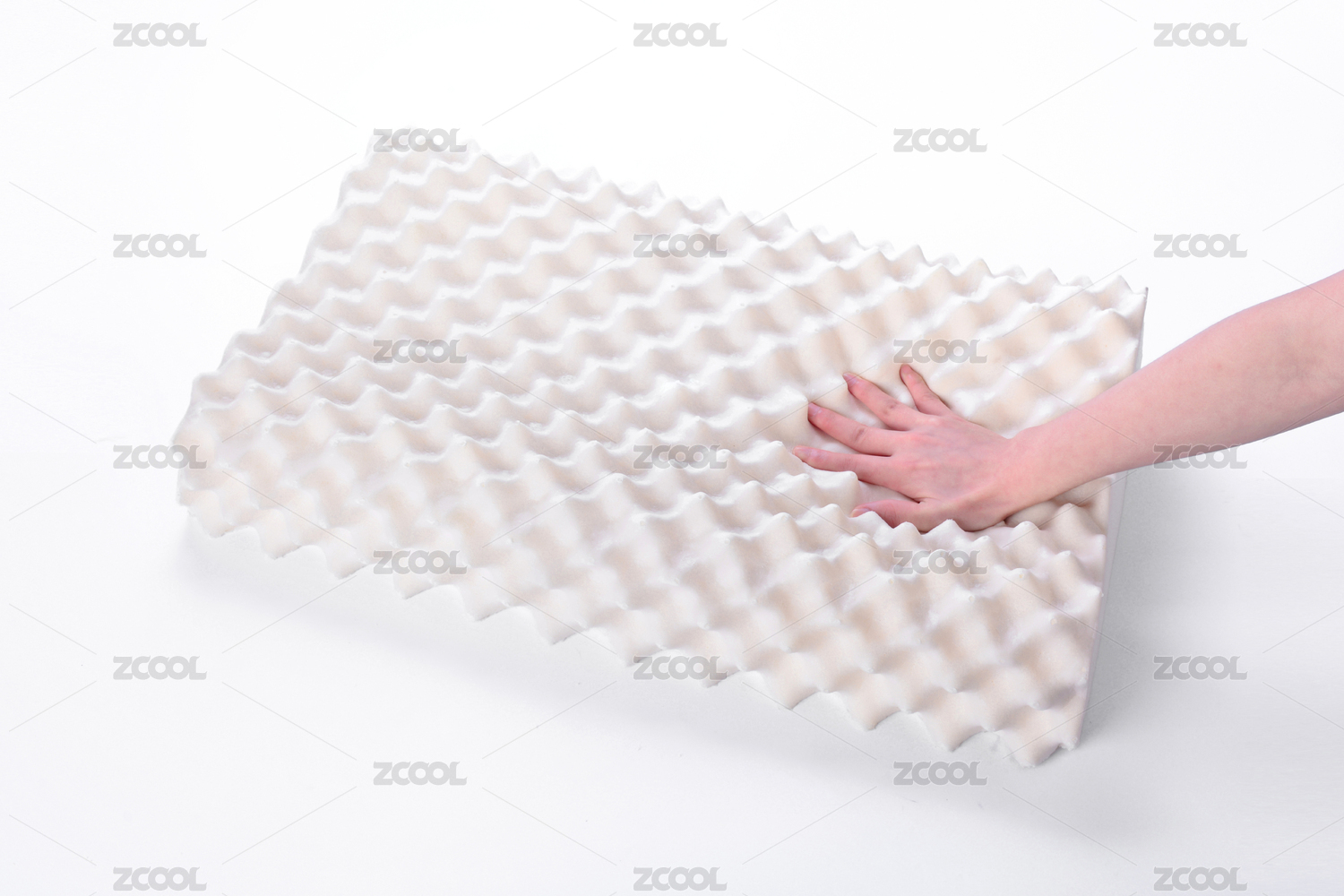 放在白色背景上用手按壓的天然乳膠枕