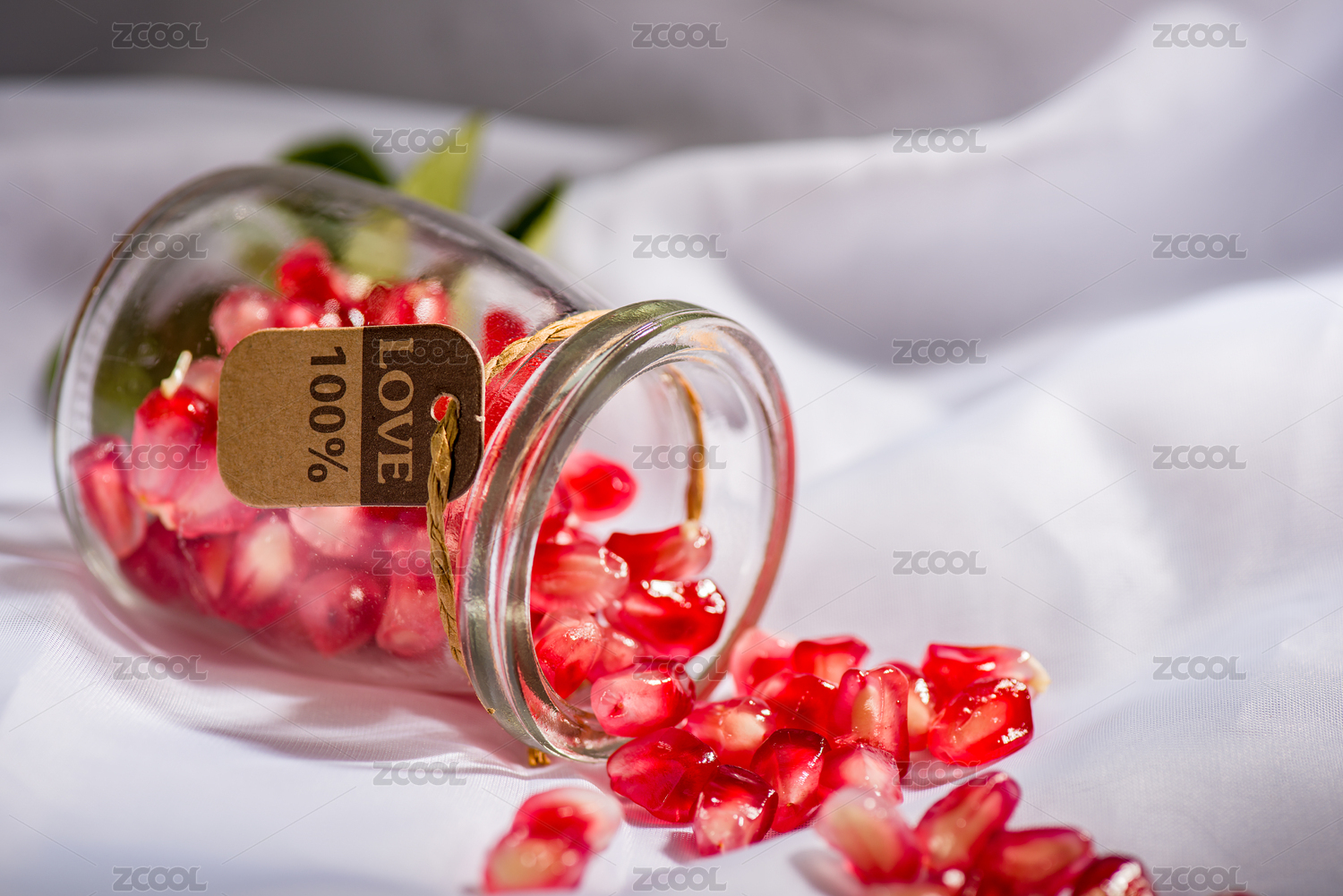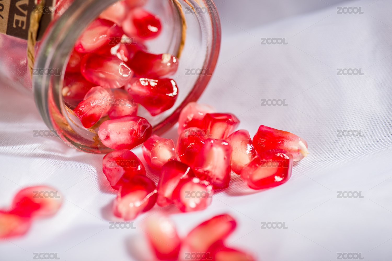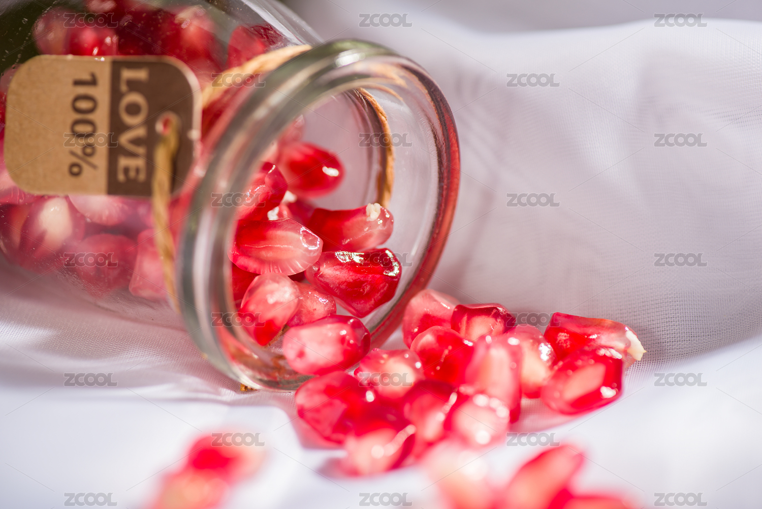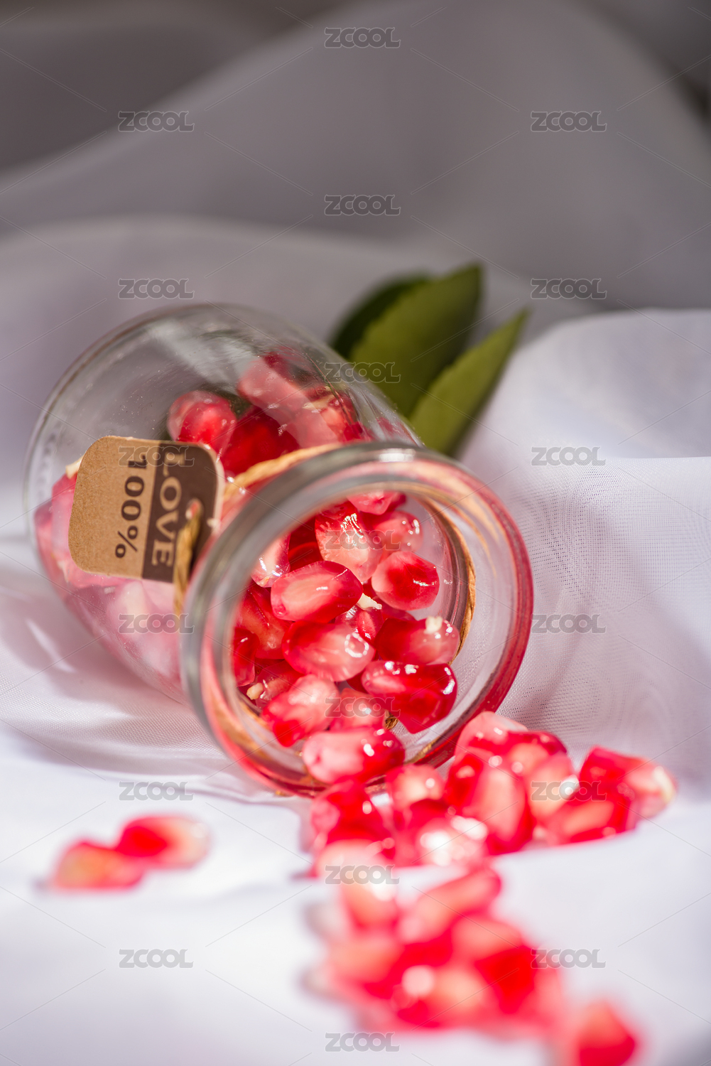 在白紗上的小玻璃罐和軟籽石榴特寫
