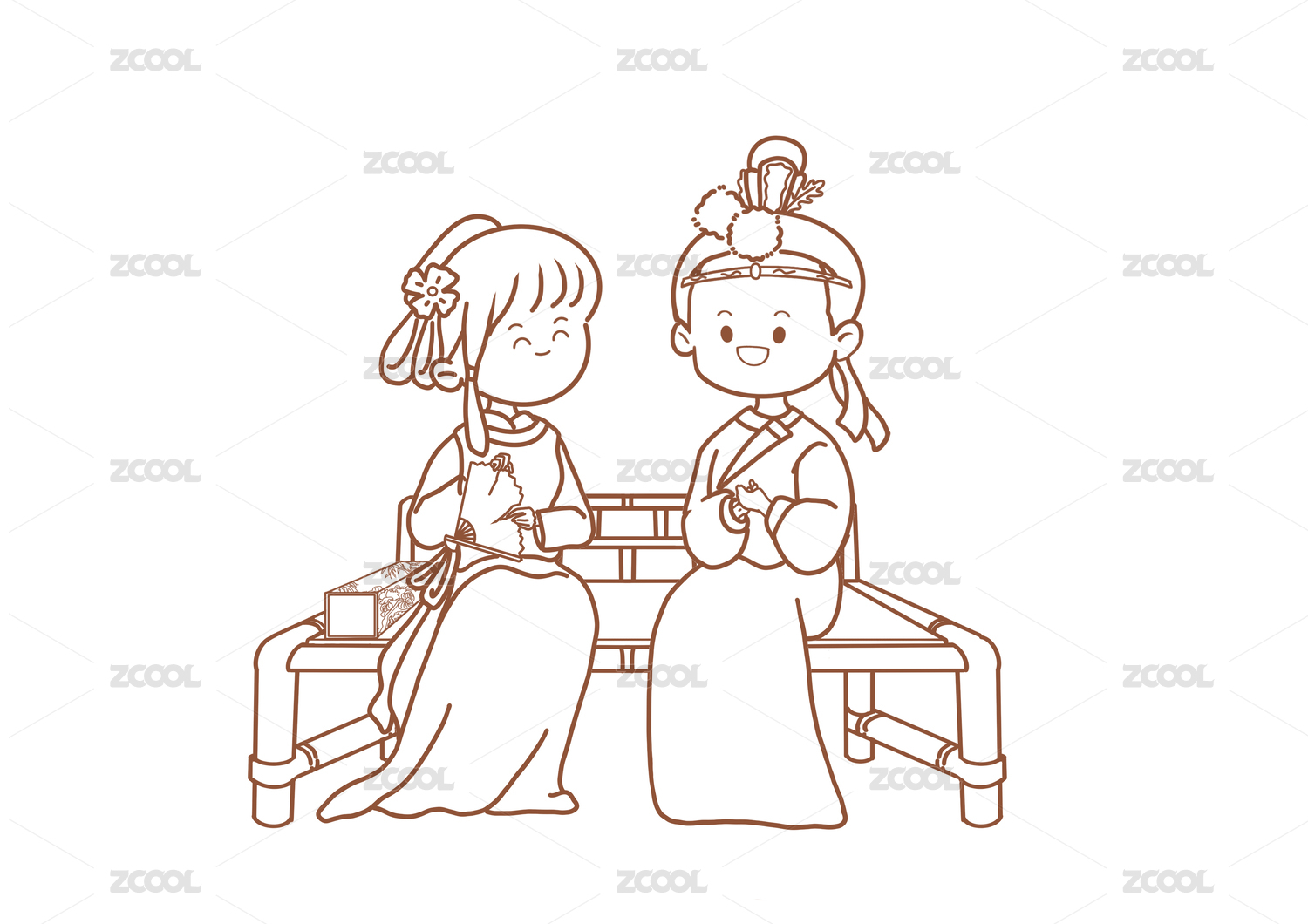 紅樓夢名場景晴雯撕扇卡通插畫線稿