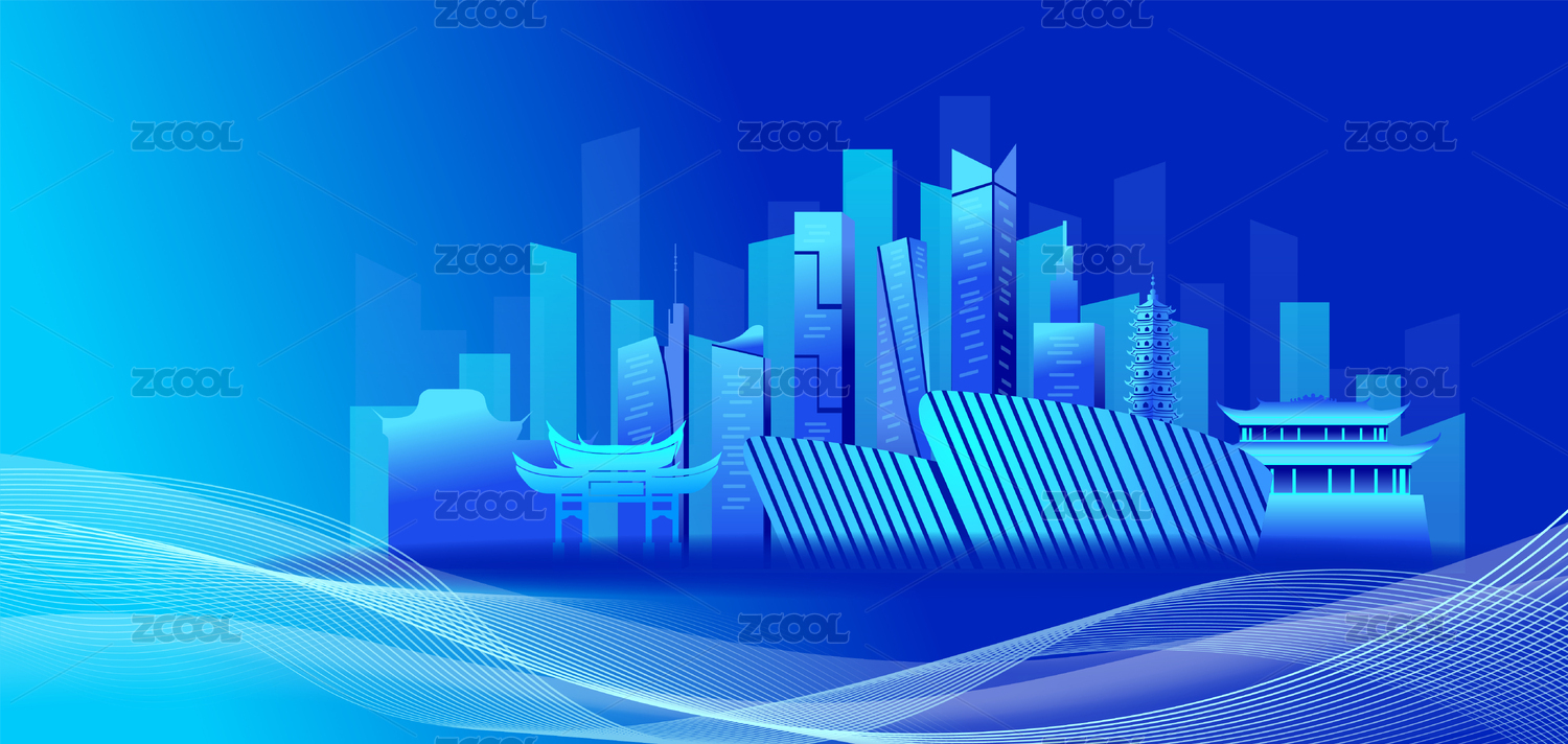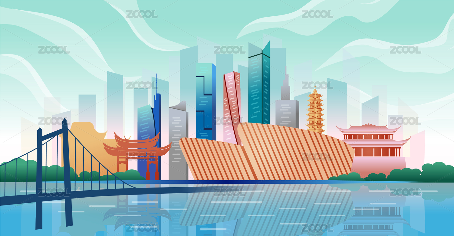 中國福建福州市商務(wù)科技城市國潮彩色插畫
