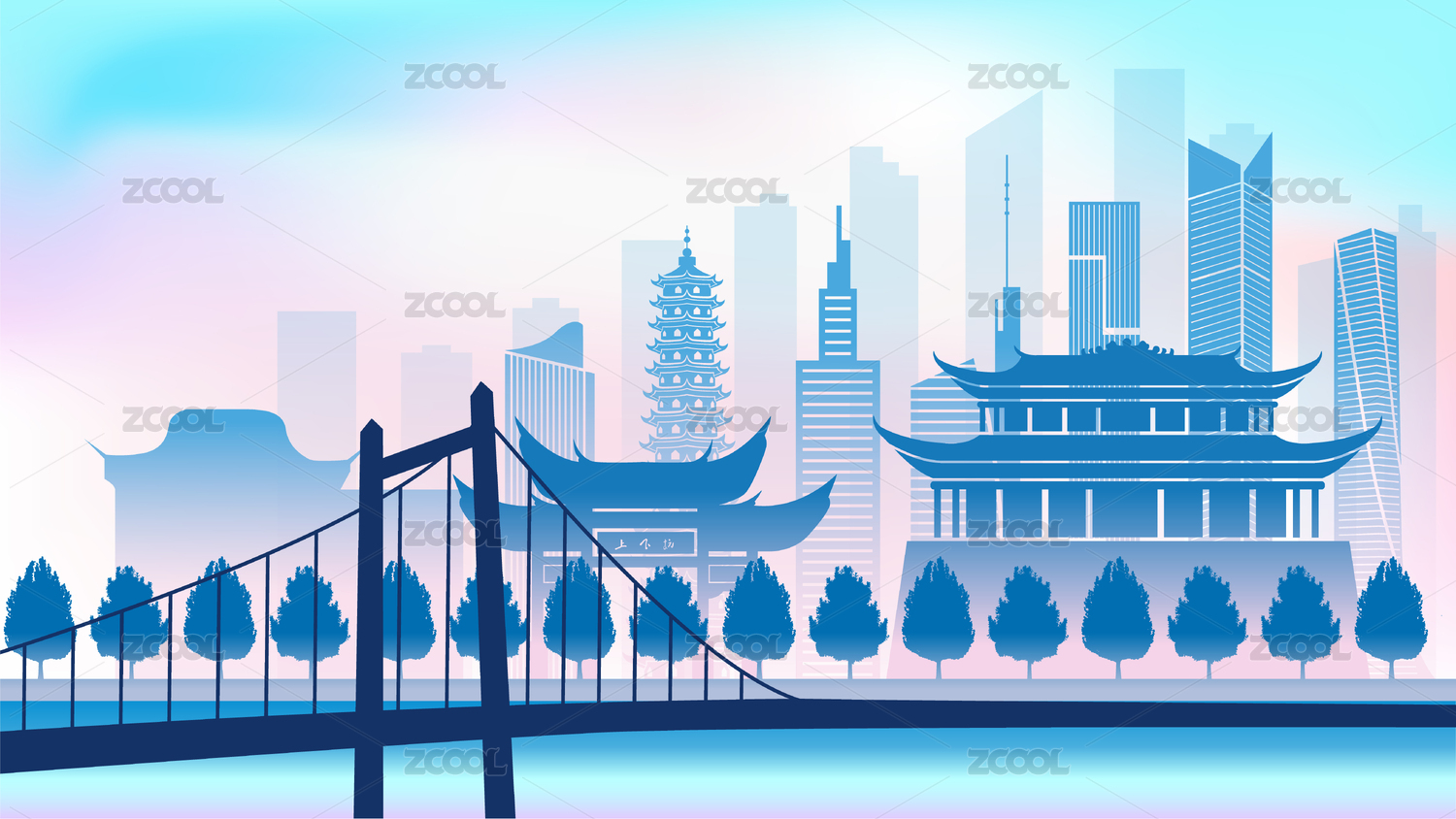 中國福建省福州市城市天際線漸變矢量插畫