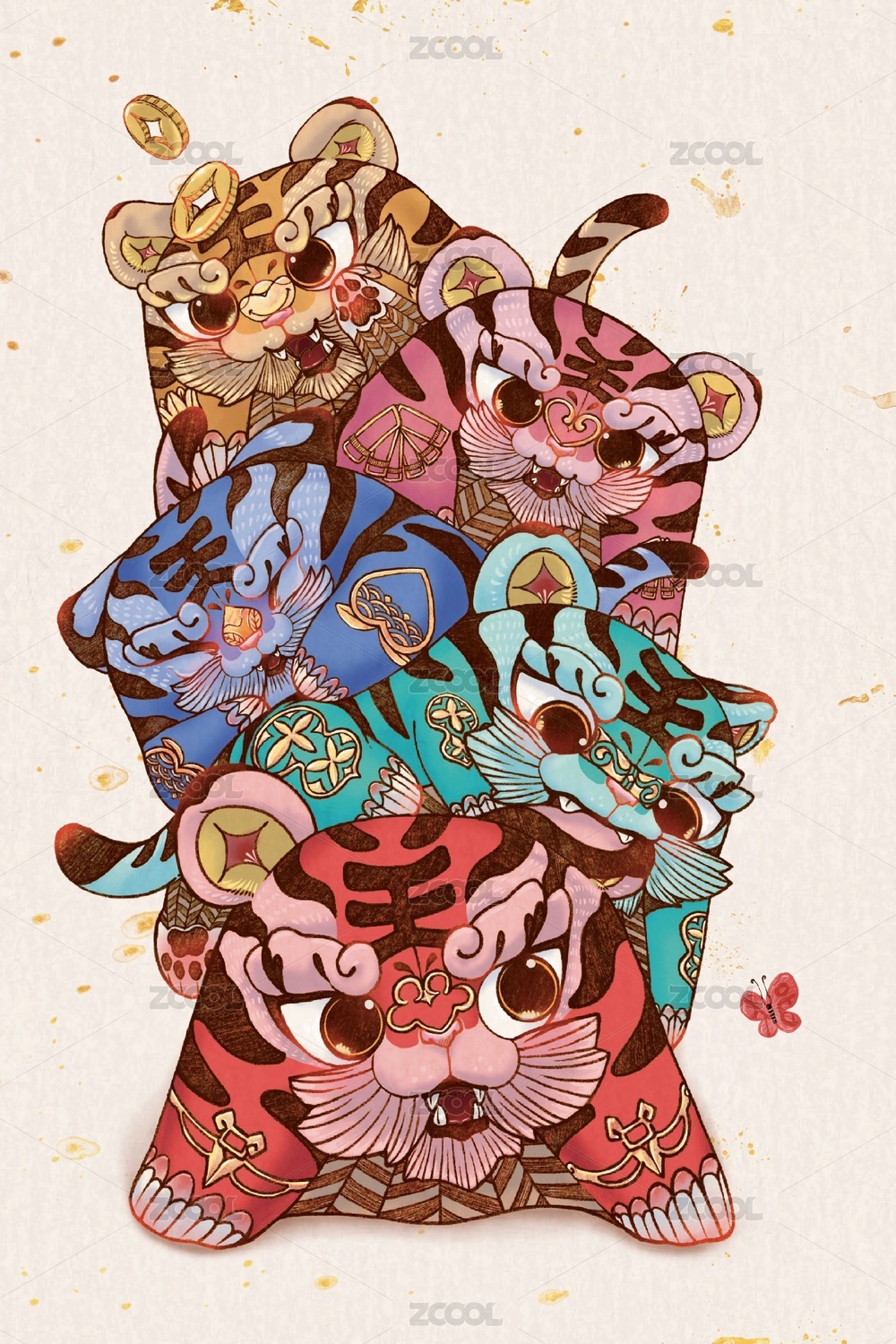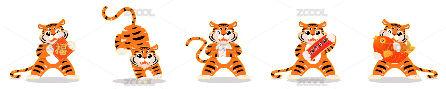 虎年五只老虎吉祥物手繪插畫