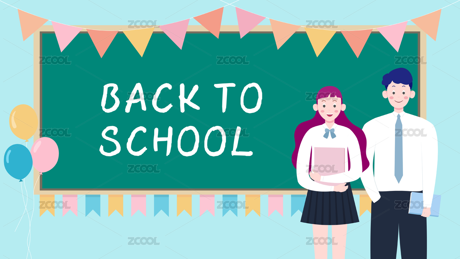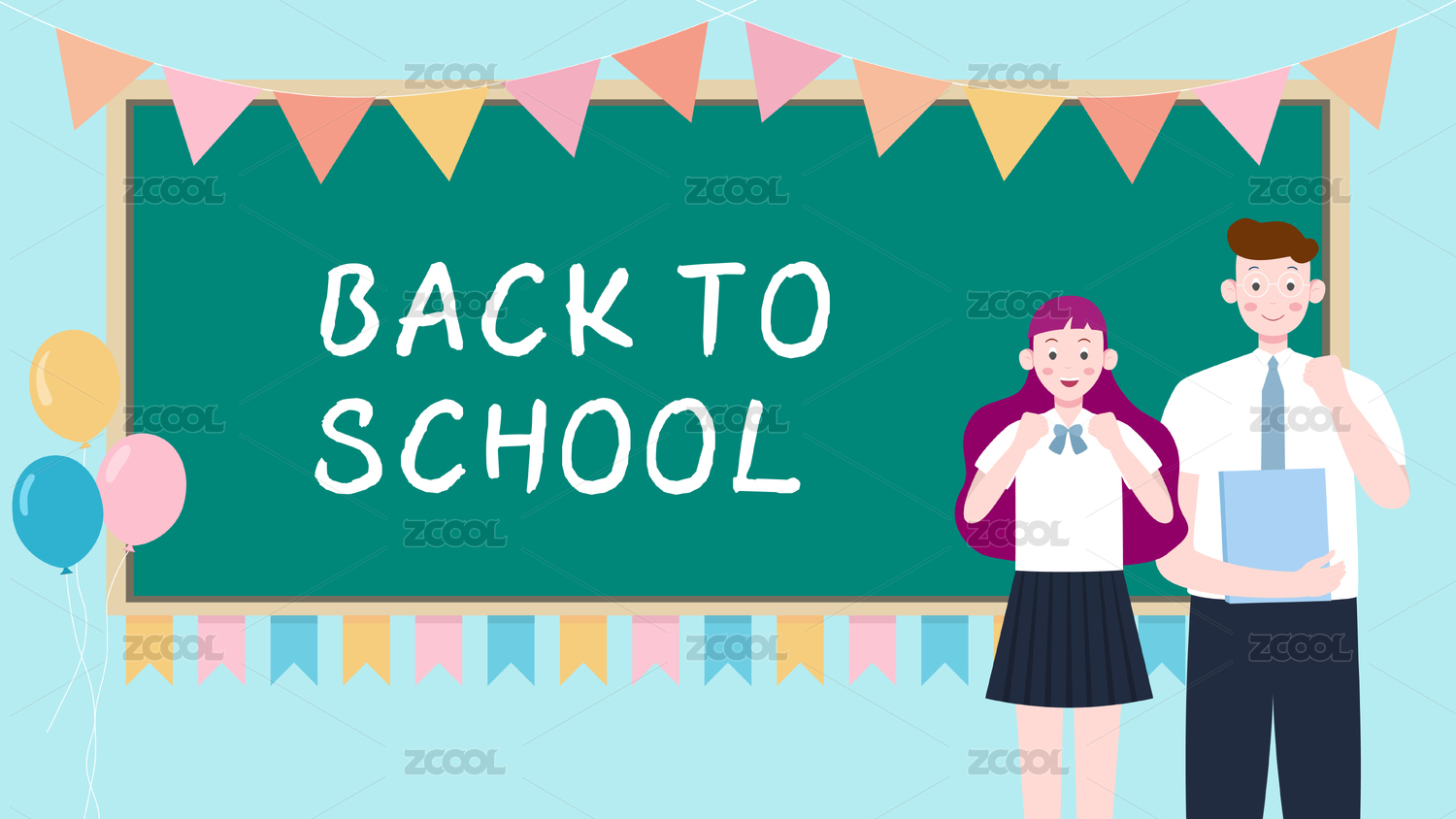 開(kāi)學(xué)典禮,學(xué)生和布置了氣球和彩旗的黑板