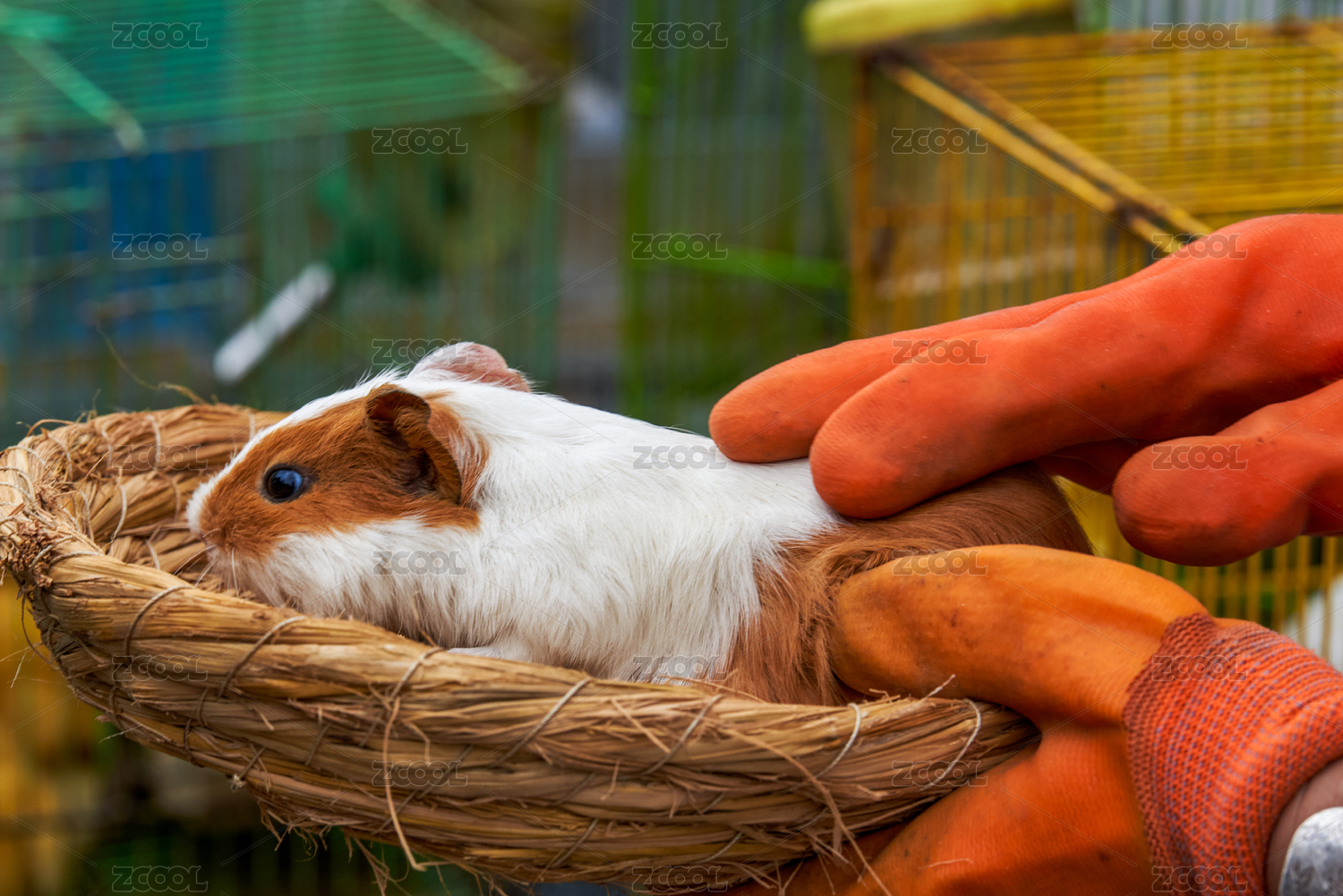 一只可愛的豚鼠趴在竹籃子上