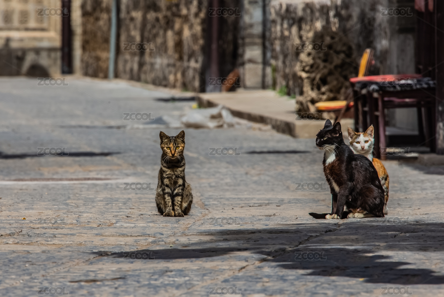 公共場所散養(yǎng)的哺乳動物三只寵物貓
