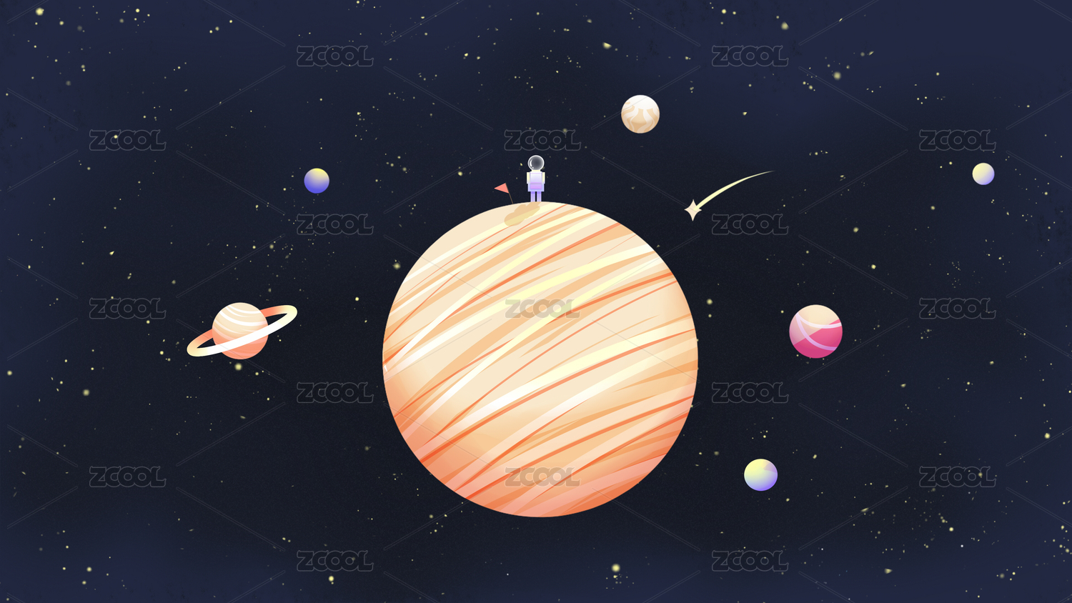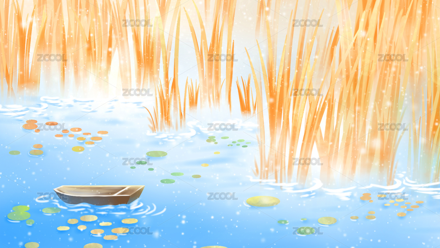 拇指大小的木船停在水面上,木船邊有小荷葉和巨大的黃色水草,唯美卡通秋天美景插畫