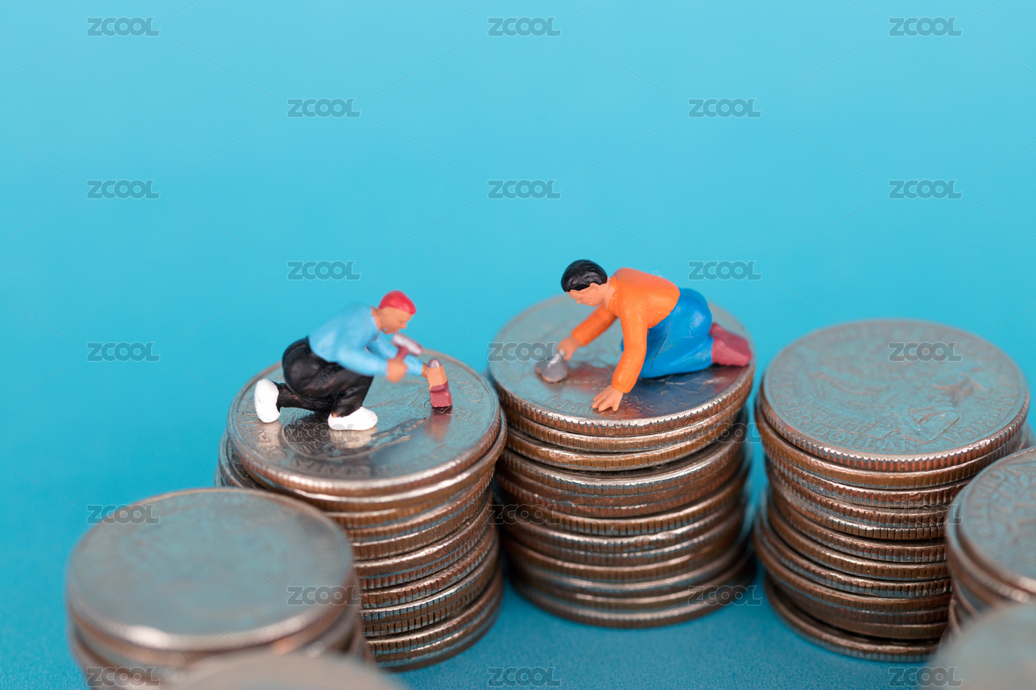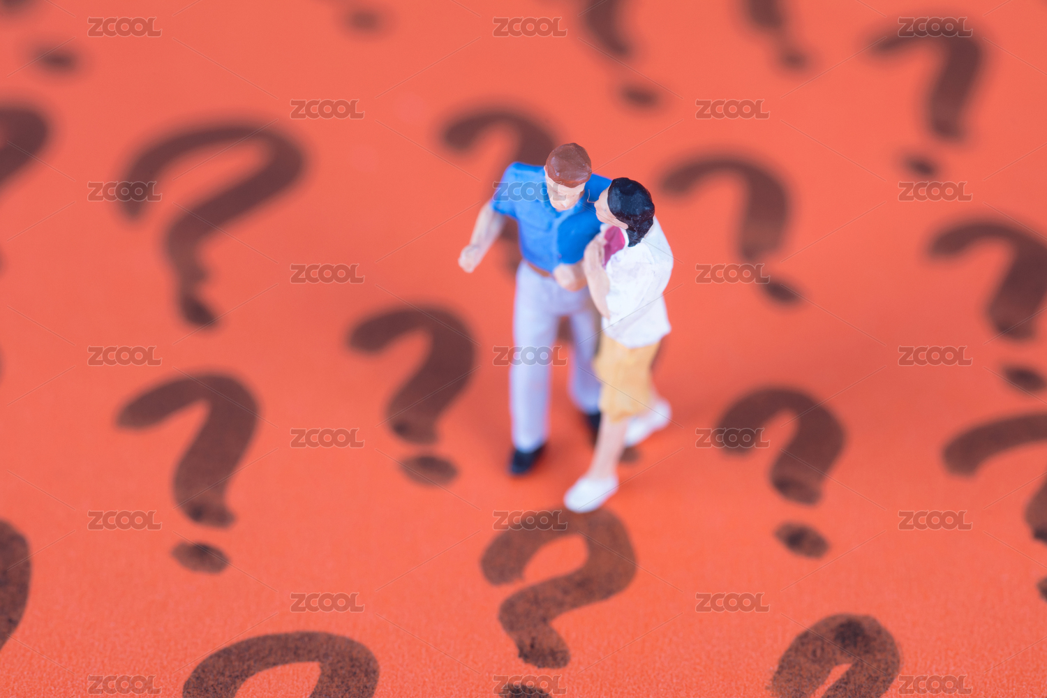 微縮夫妻人偶模型走在滿是問號(hào)的背景上