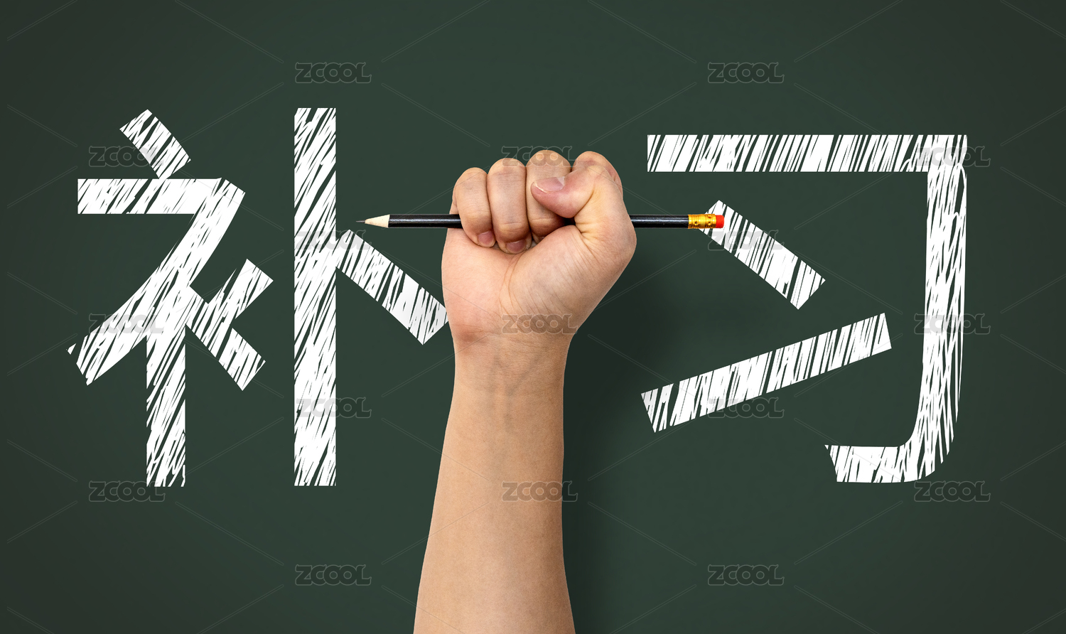 手握鉛筆背后的黑板寫(xiě)著補(bǔ)習(xí)