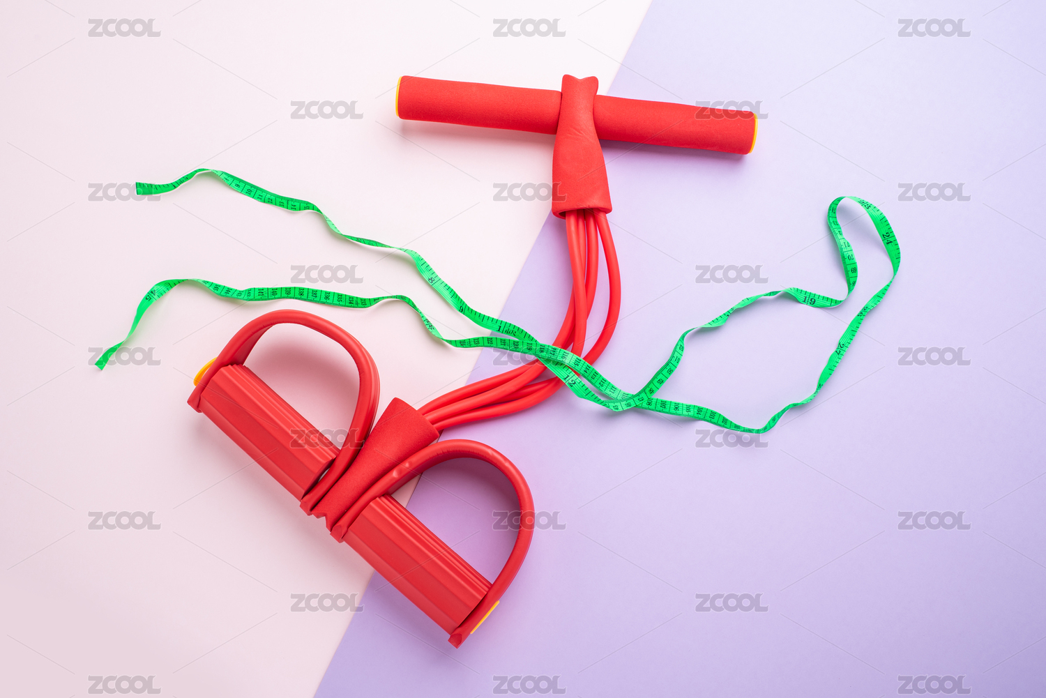 白色桌面上的黑色啞鈴和紅色拉力帶