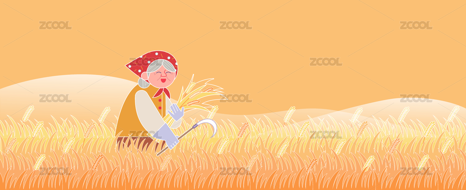 農(nóng)民老奶奶手持鐮刀手捧麥子在金色麥田中橫