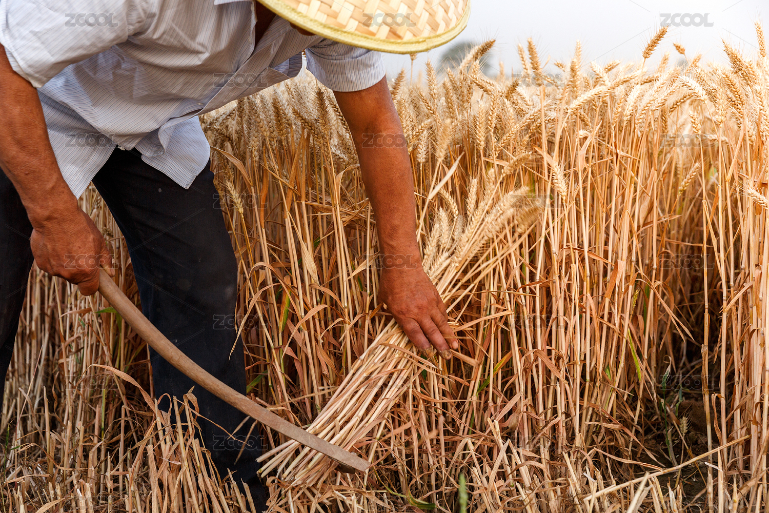 麥地里一位農(nóng)民用鐮刀在收割麥子