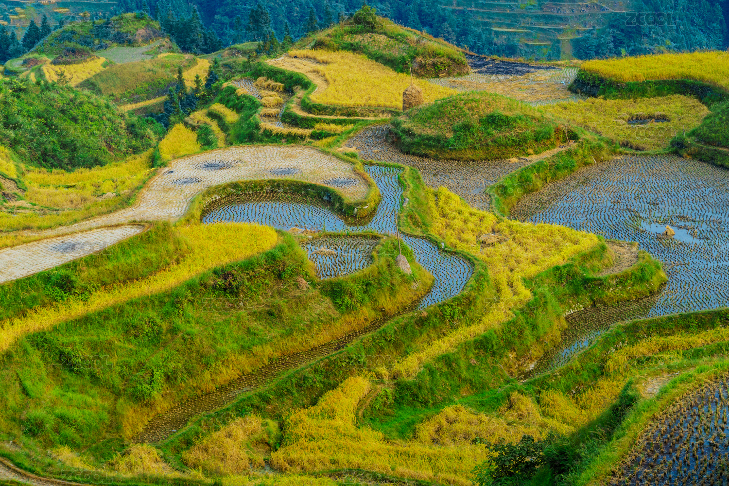 中國(guó)貴州黔東南加榜加車(chē)村秋季傍晚鐮刀梯田