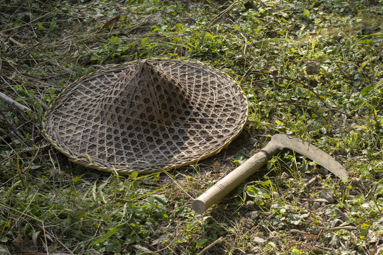 草地上的竹編斗笠與生銹鐮刀農(nóng)具靜物