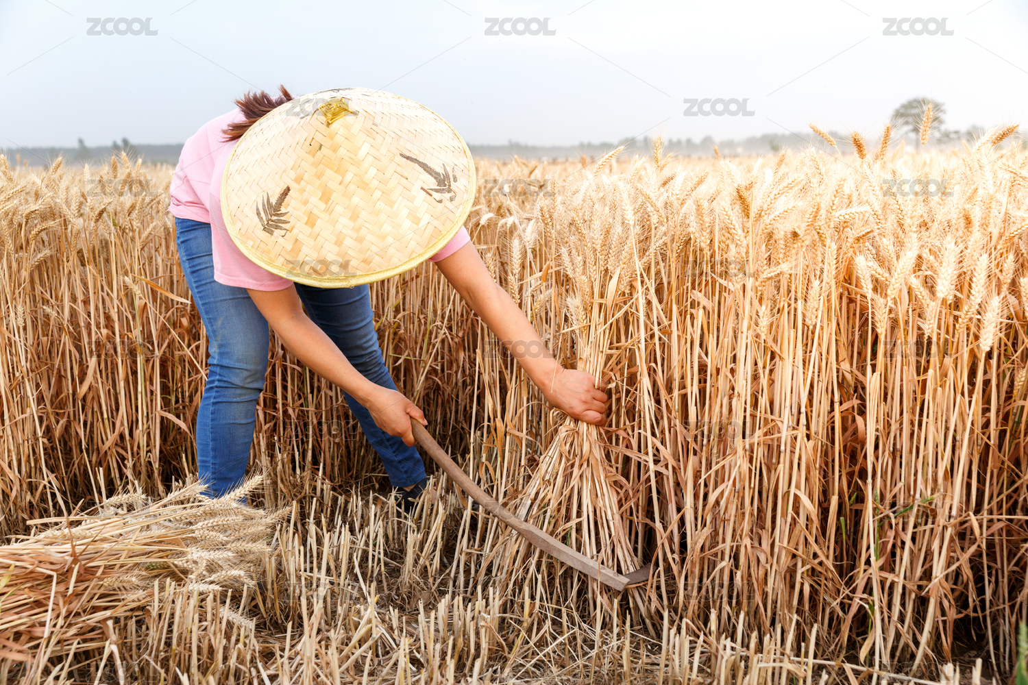 麥田里一位農(nóng)村婦女正在用鐮刀收割麥子